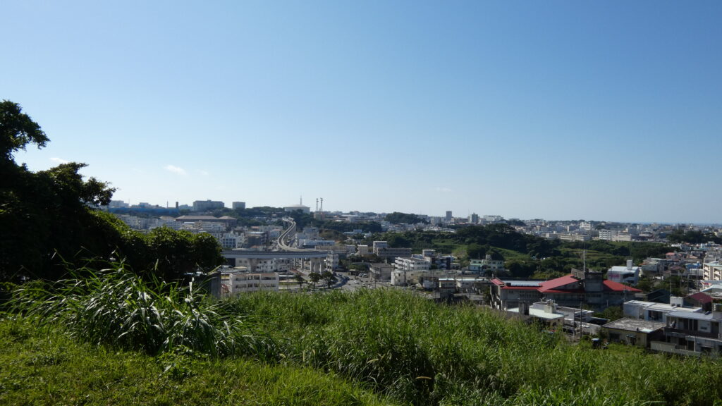 東のアザナに着きました。相変わらずすばらしい景色です。正殿もよく見えます。浦添城はどの辺りでしょうか。尚寧王は浦添ようどれで眠っています。きっと生まれた浦添が、安らぎの場所だったのでしょう。