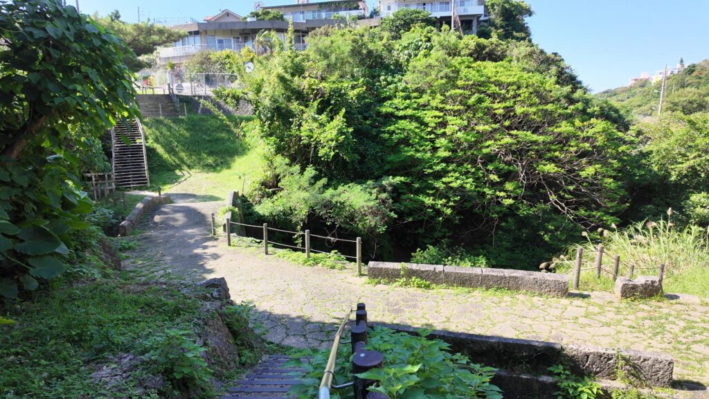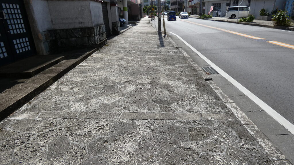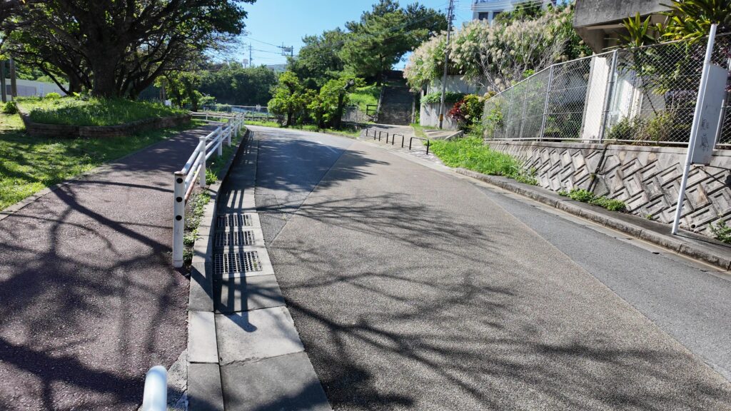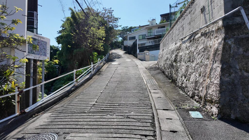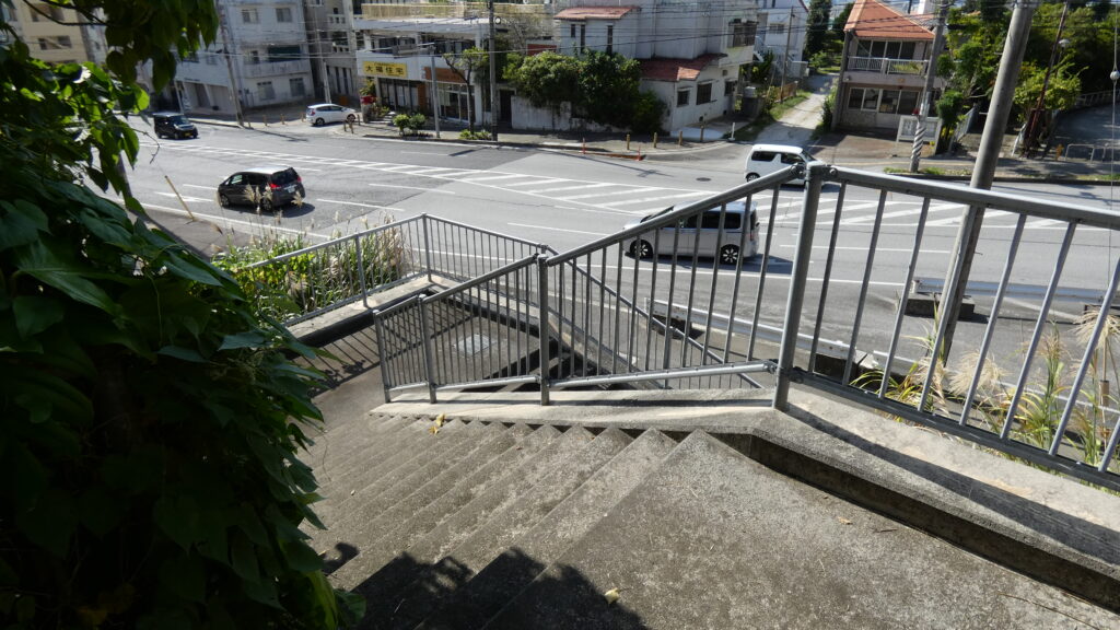 ここからは道を折り返して、那覇に向かっていきます。一路首里城を目指します。浦添御殿から下って、通りに合流したら、すぐに右折します。その先がフェーヌヒラです。南の坂という意味です。こんな坂があるあとは意外ですが、那覇は「坂の町」と言われているそうです。こういうのは歩いてみないとわかりません。