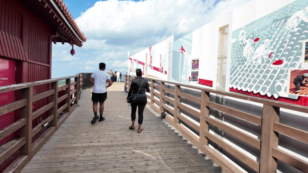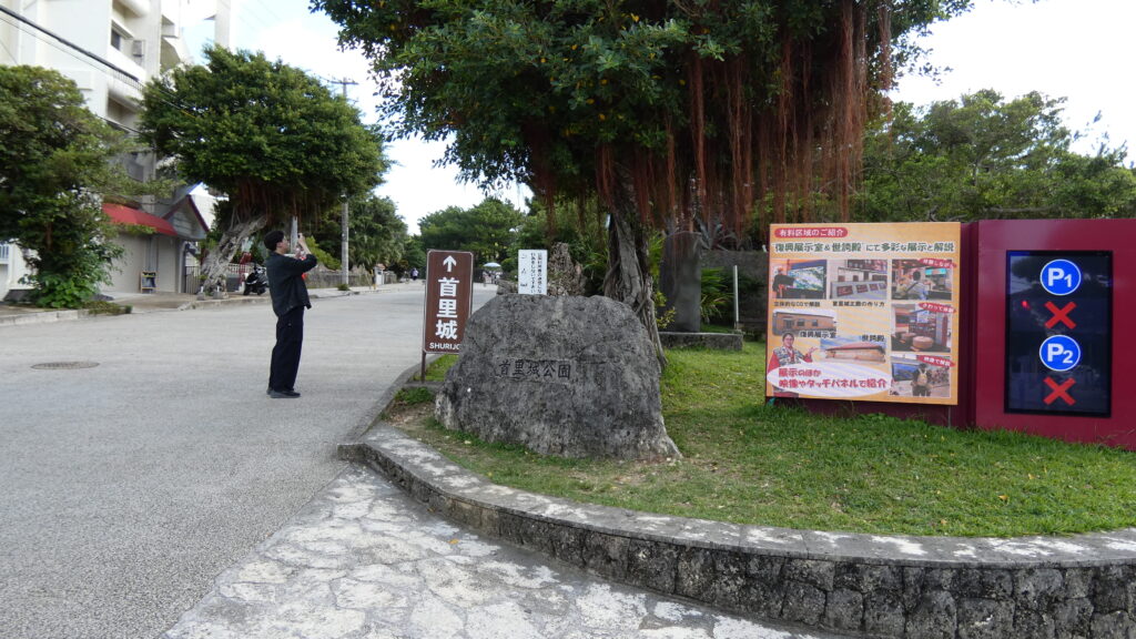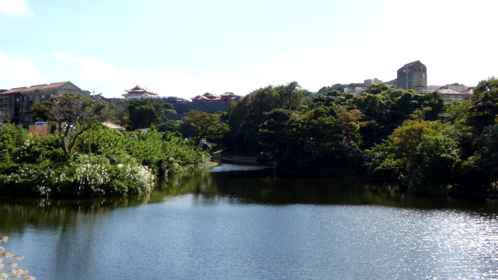 龍潭の畔です!ここから見ても、首里城の再建が着々と進んでいるのがわかります。尚寧王の道のゴールはもうすぐです。首里城公園の入口に向かいます。ここをゴールにしましょう。すごい達成感でした。