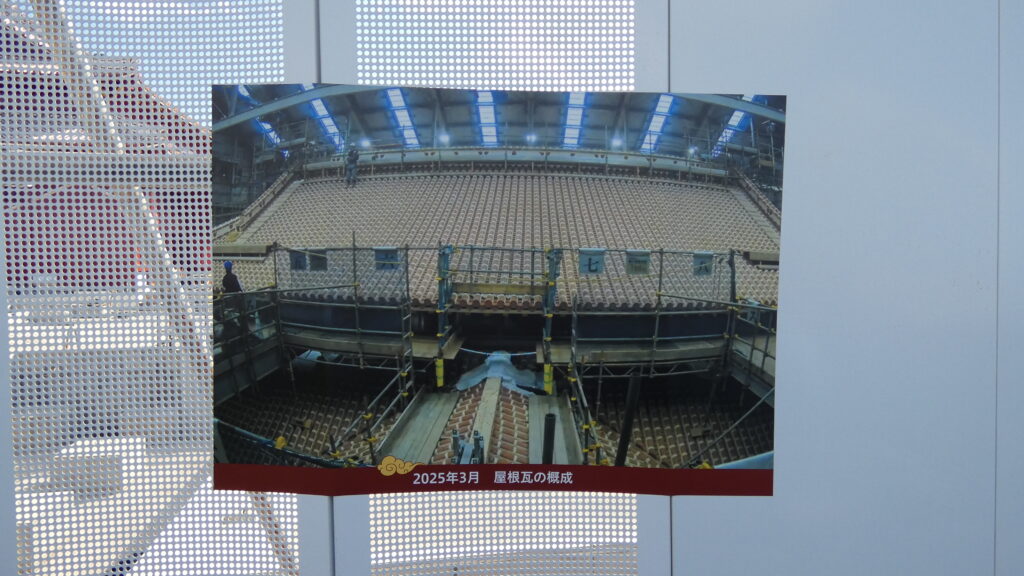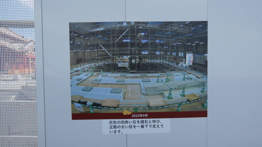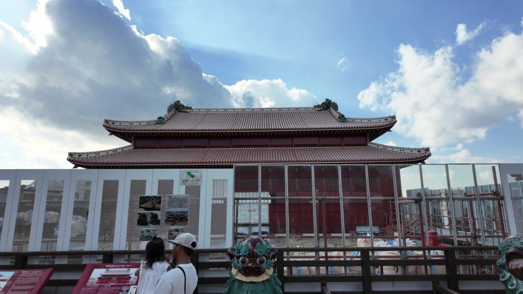 まだ工事中の壁に覆われてはいますが、小窓から正殿の勇姿が見えます。2025年10月に素屋根は撤去されました(取材時点:2025年11月)。2026年秋の完成を目指して工事が進められています。