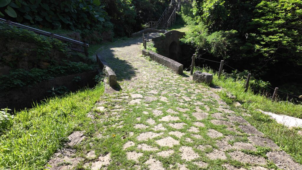 ここからが尚寧王の道です。石畳の道です。発掘調査に基づき、復元されたものです。石の中にはオリジナルのものもあるそうです。石畳が終わって坂を下り、突き当たったら右に曲がります。