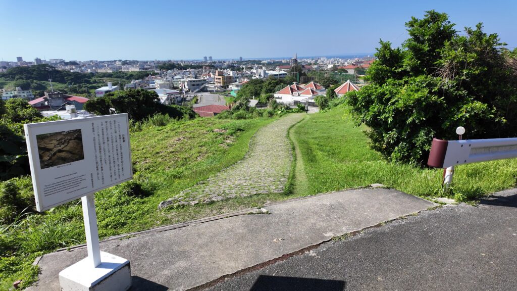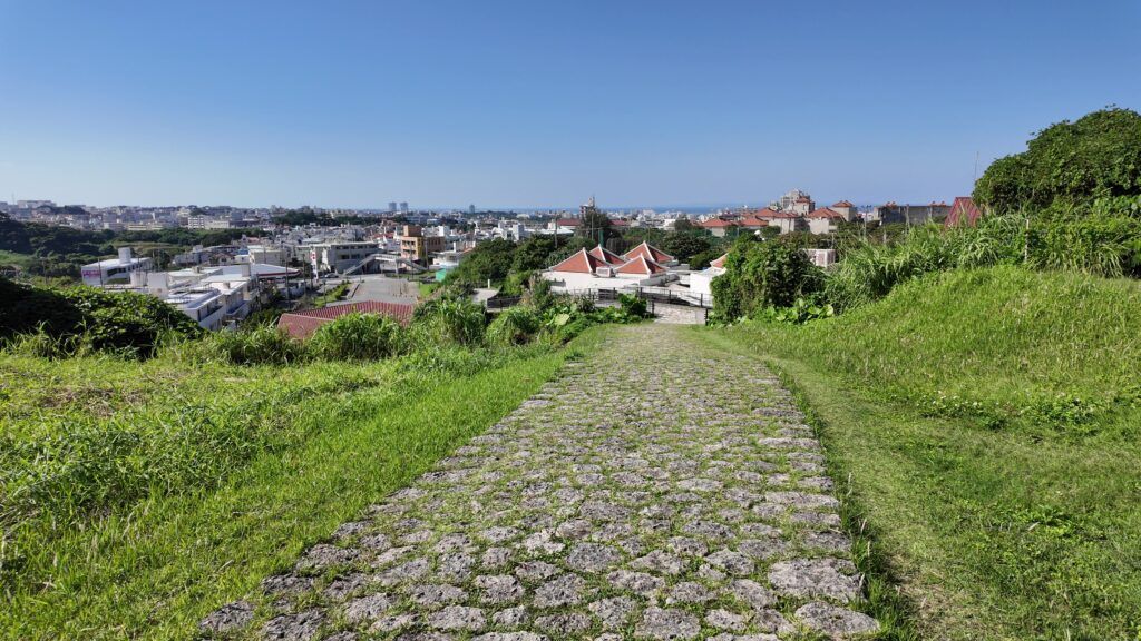 ようどれとは反対側の「浦添城の前の碑」に移動しました。尚寧王が、首里・浦添間の道路竣工を記念して建てたものです。振り返ると、首里方面が見えるのですが、前回のズーム画像と比較すると、首里城正殿の本物の屋根が見えて、期待できそうです。石畳道の方に行きます。向こうに海や、近くには発掘されたオリジナルの石垣も見えます。