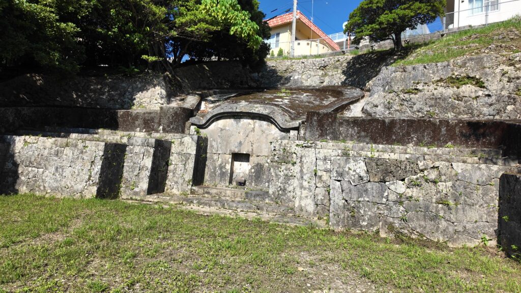 次の見どころに着きます。浦添御殿(うどぅん)の墓です。琉球国王の親戚、浦添家のことで、代々浦添を領地としてきました。その由緒ある家のお墓です。沖縄のお墓はみんな立派ですが、これはまたひときわすごいです。