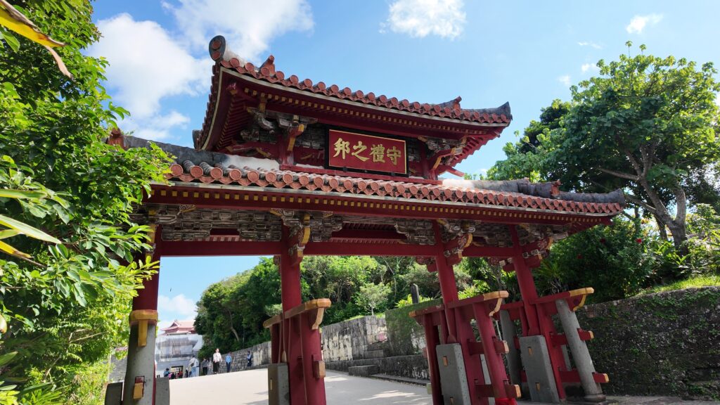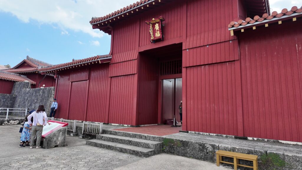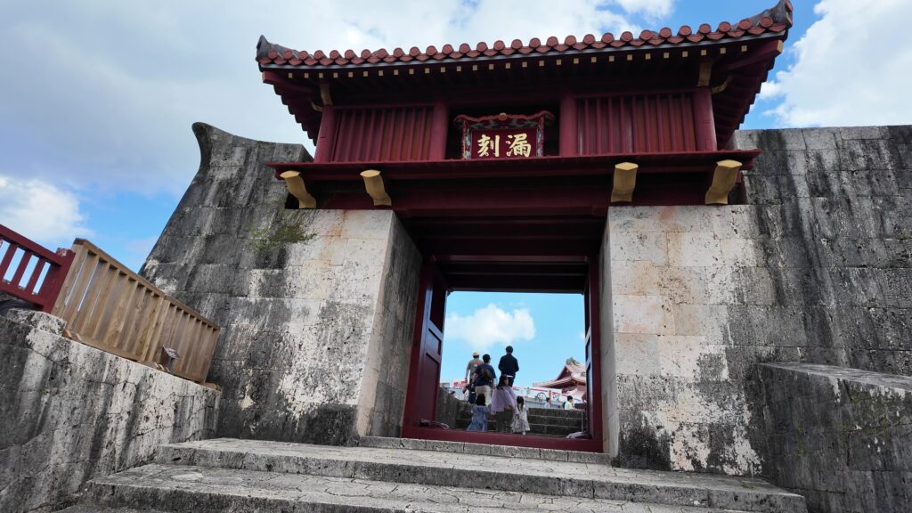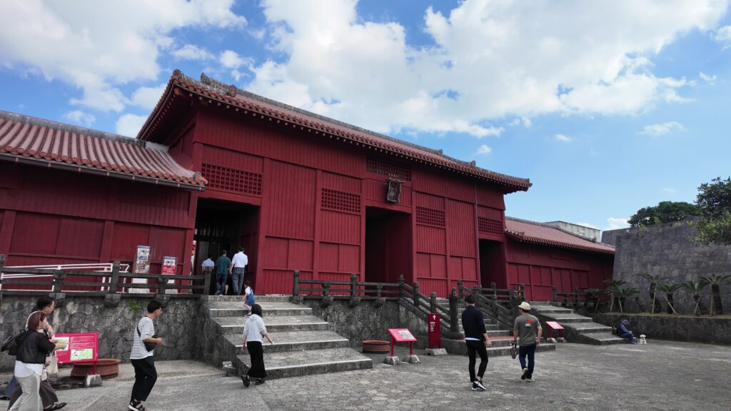 それでは、首里城がどうなっているか見に行きましょう。守礼門に来ました。薩摩軍が首里城には攻め込んだとき、そのときの王様も尚寧王で、和議の方針になっていました。ところが、一部の家臣は抵抗の姿勢を見せたため、薩摩兵は、守礼門の柱を楯にしながらグスクに迫ったそうです。
