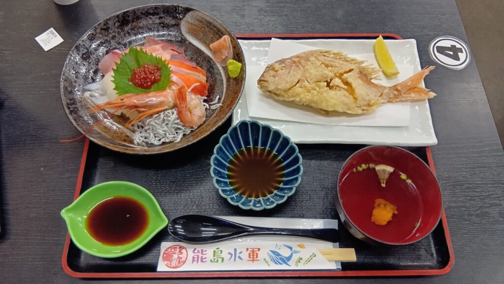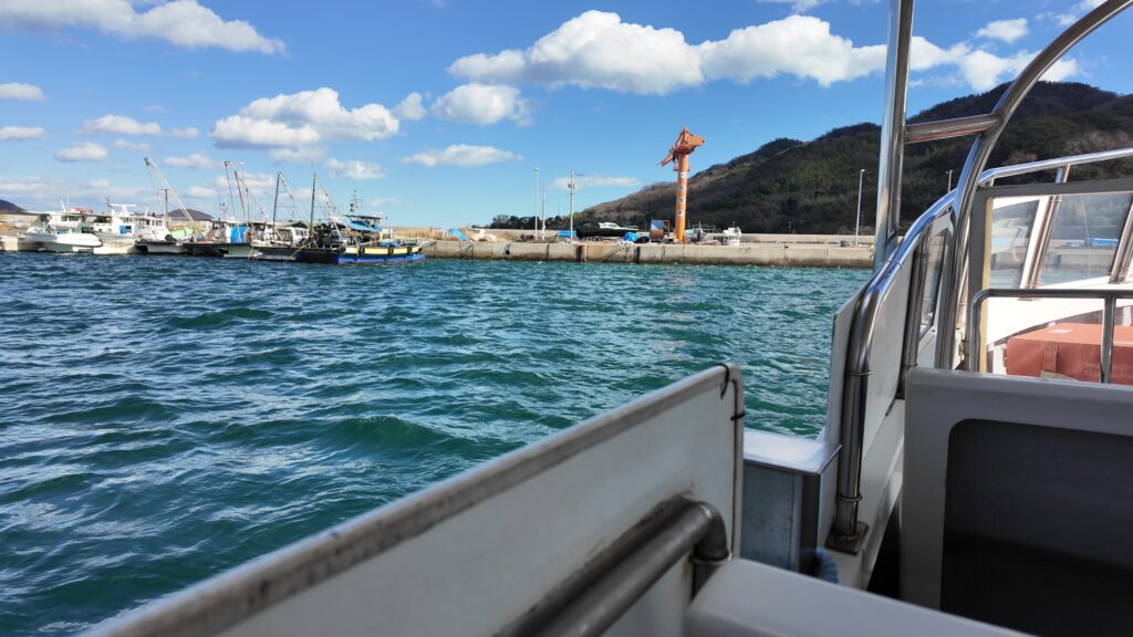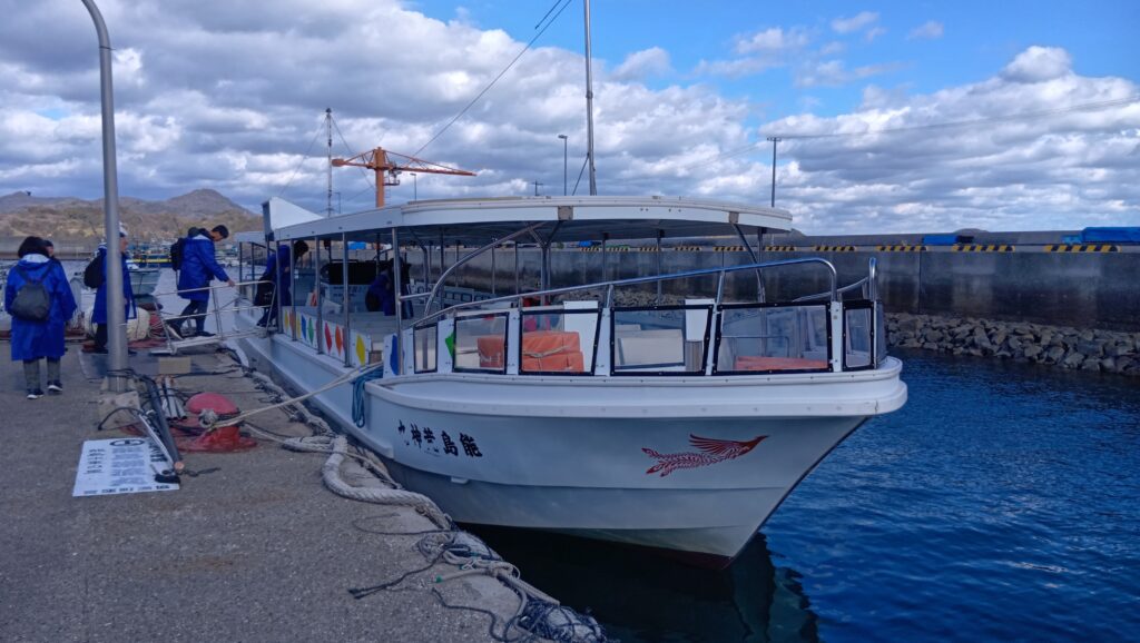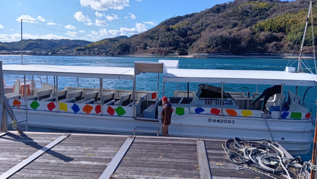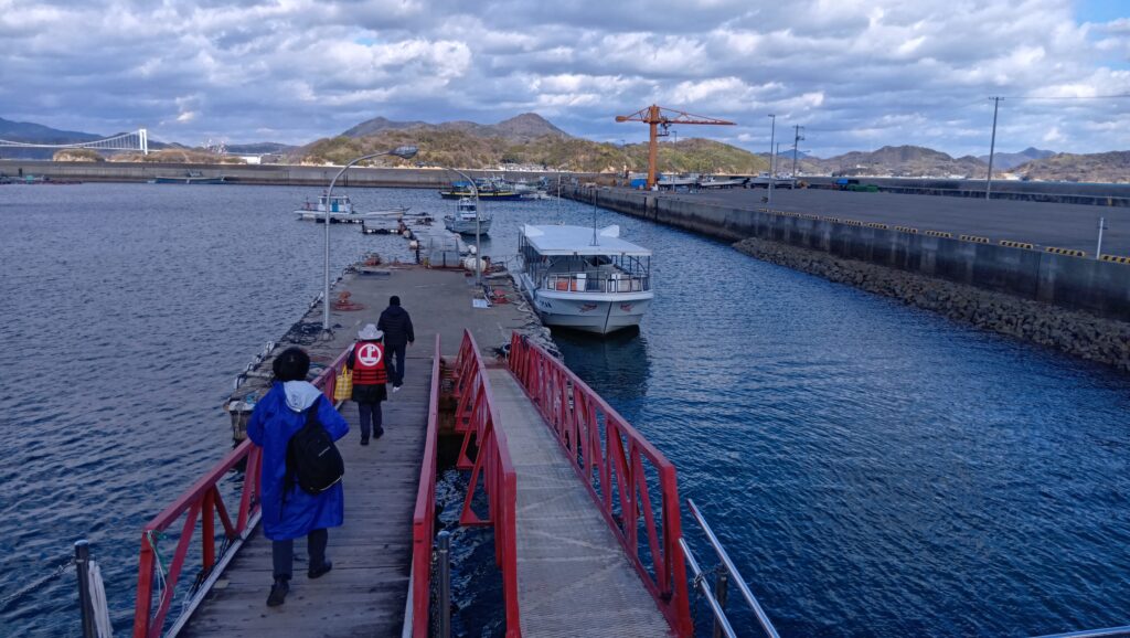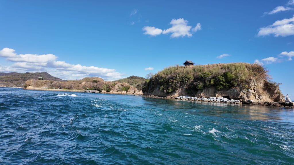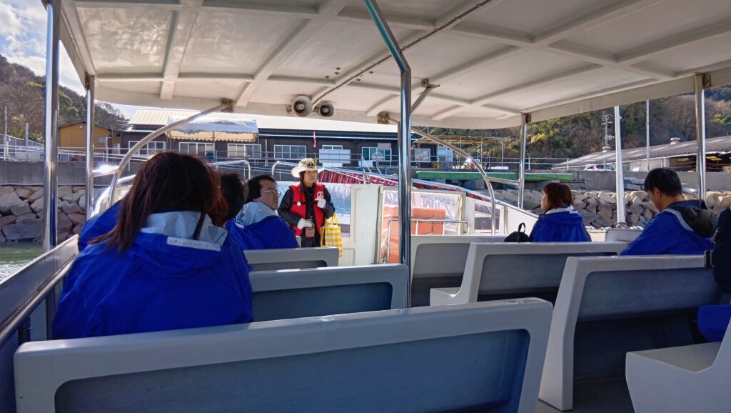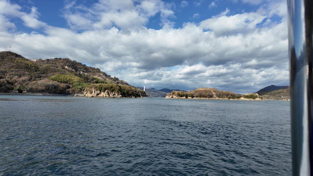 宮窪町漁協・能島水軍の前に来ています。ここでは、地元の魚を使った料理を味わえますし、なんといっても、ここから能島上陸ツアーが出発するのです。今回は、能島城現地レポートが中心になるのですが、その前後では、最大10ノットの海峡の潮流も体験できるのです。最後の方で、向かい側にある、村上海賊ミュージアムにも立ち寄ってみたいと思います。それでは、いよいよ上陸船に乗り込みます。席についたので出発です。