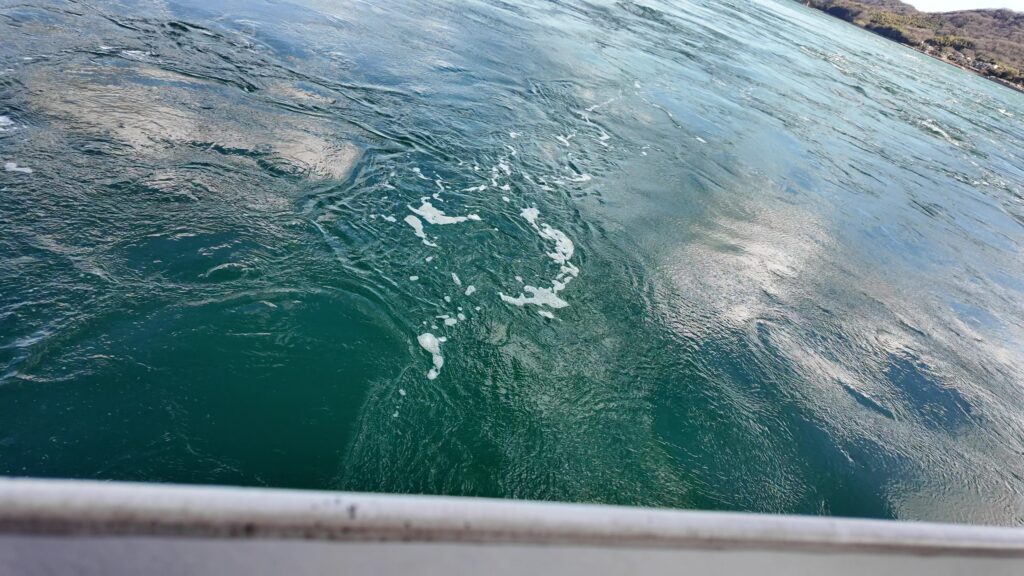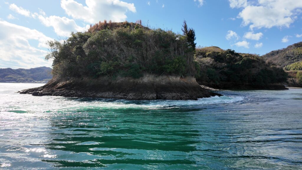 能島を離れます。すごい快速で、すぐに鯛崎島まで来てしまいました。この周辺も潮流が複雑で、その流れが海の芸術のようです。