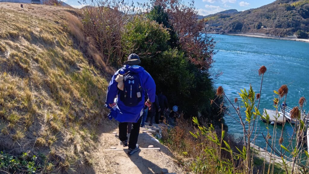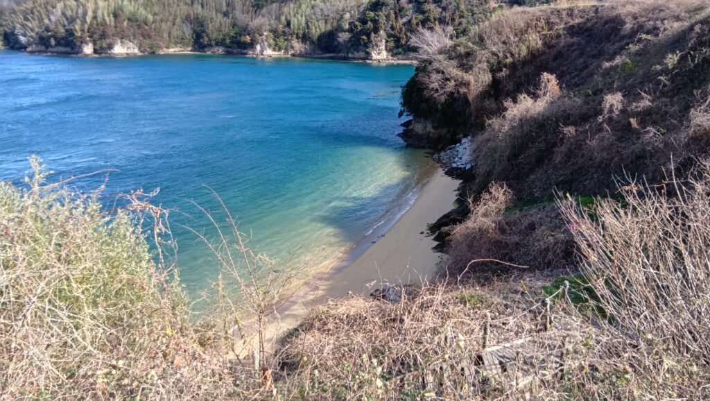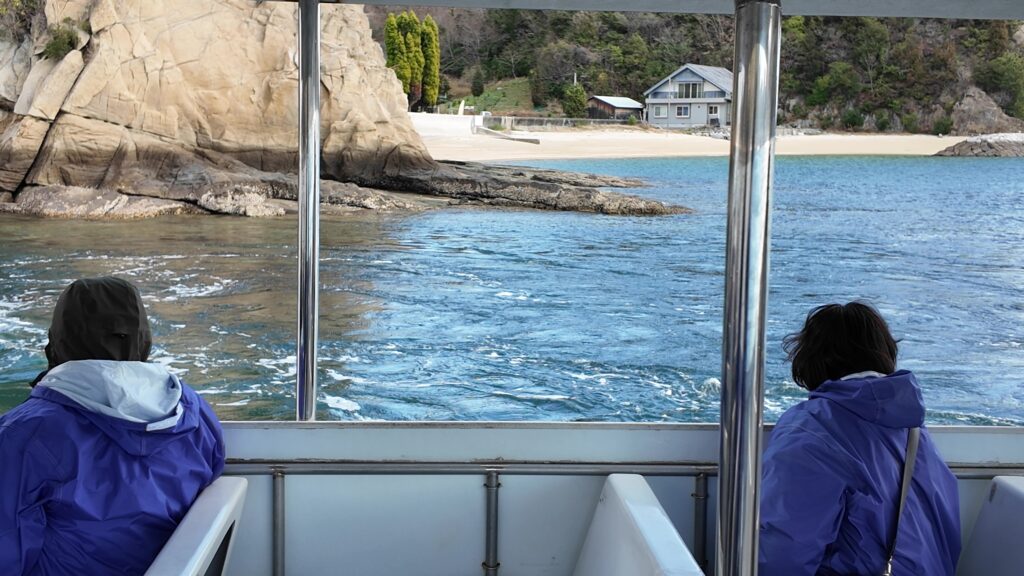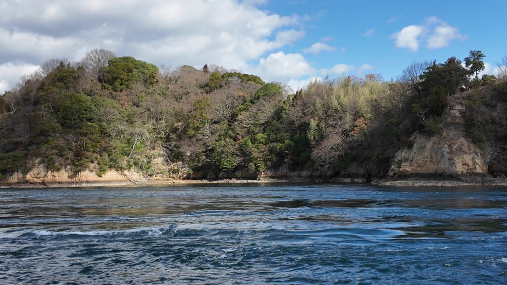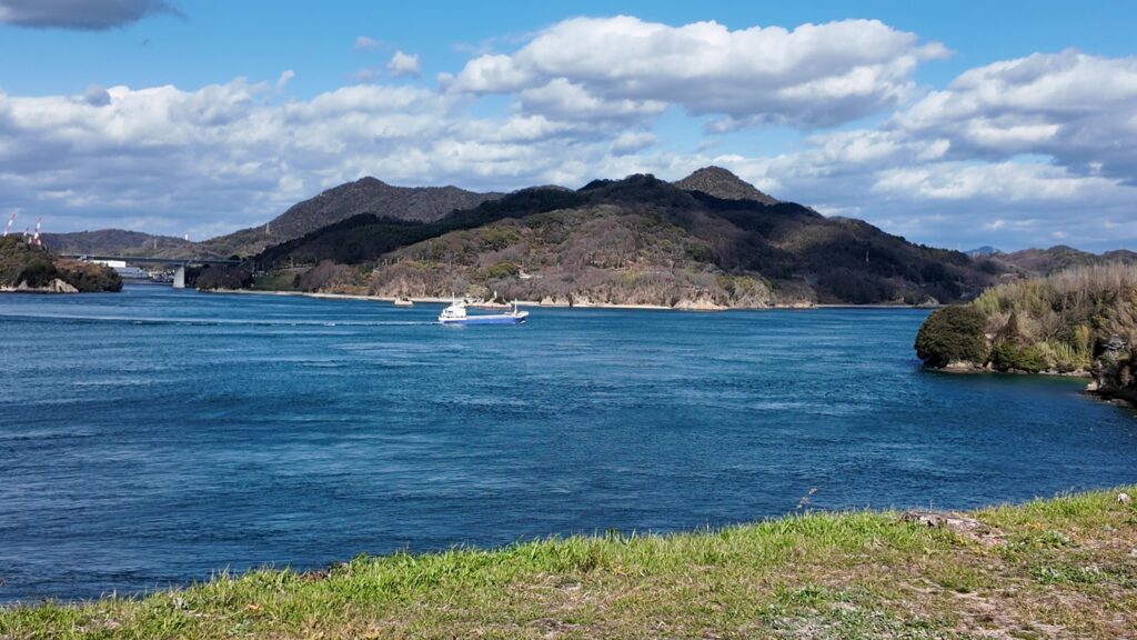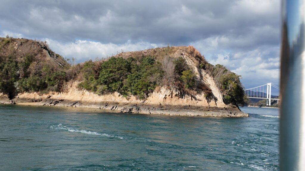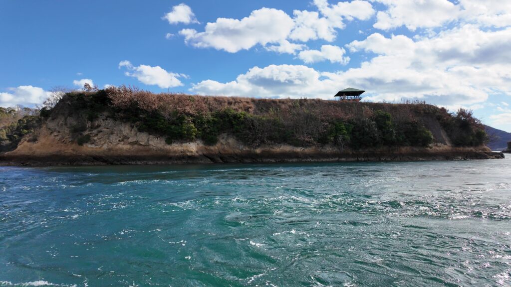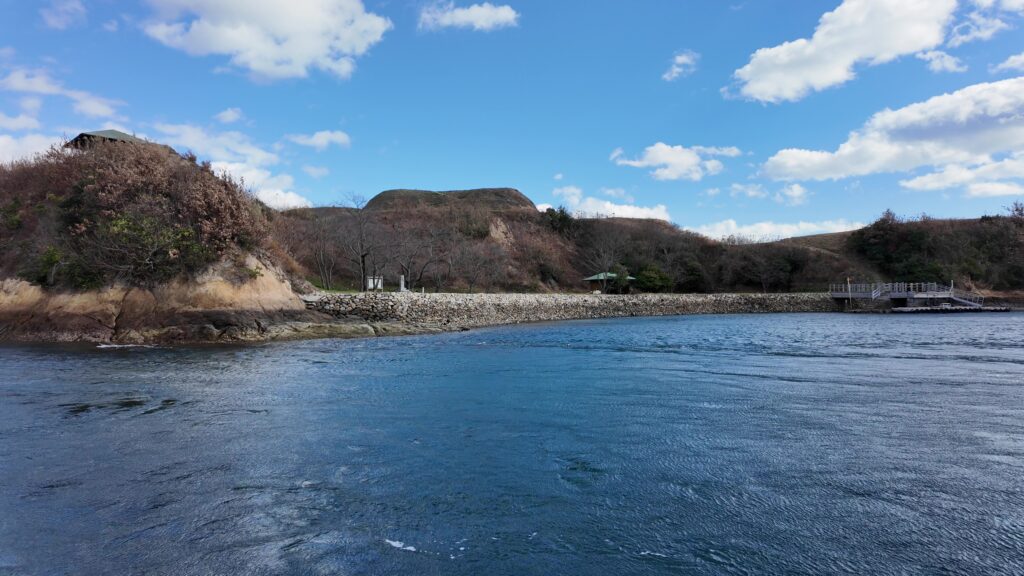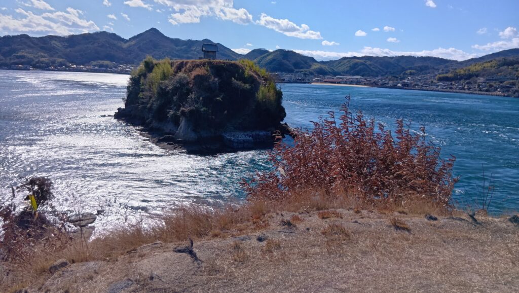 そのとなりにある島が「鵜島」です。島の間は、すごい潮の流れです。この島には、村上海賊の軍船の造船所や、メンテナンス場(焚で場)があったそうです。