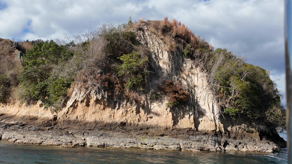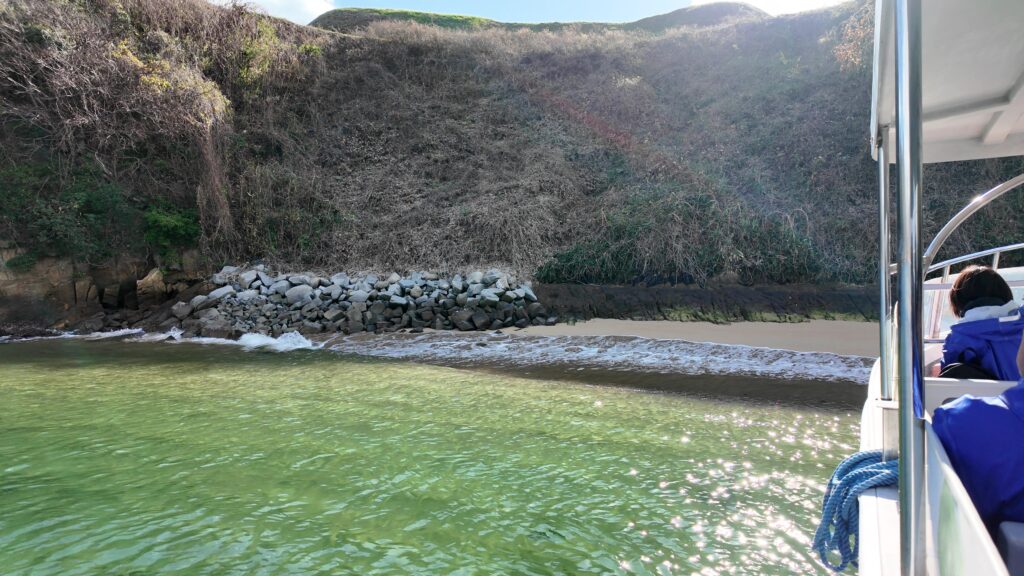 わたしたちの上陸地点(南部平坦地)も見えてきました。そちらに向かって戻ります。その途中で、当時の城内通路の遺構を見ることができます。船が迎えにきました。