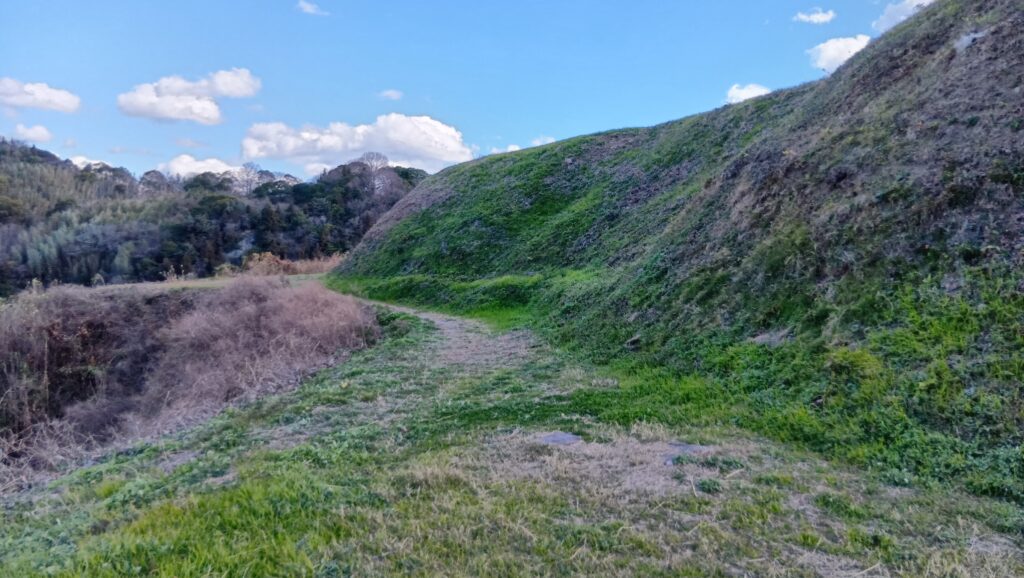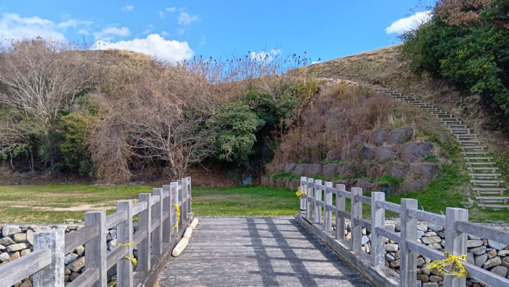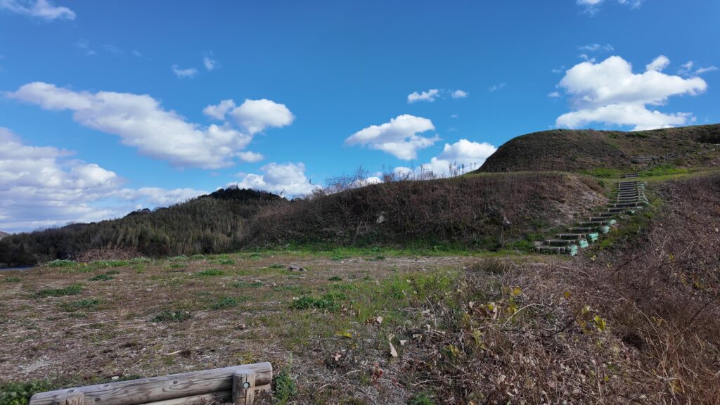 城周辺の地図園路に沿って進んでいきます。登ったところが三の丸で、入口辺りに礎石建物跡があって、倉庫だったと考えられています。三の丸は思ったより広々としています。他にも住居か倉庫の跡が発見されています。物見やぐら(井楼)かもしれない跡もあるそうです。