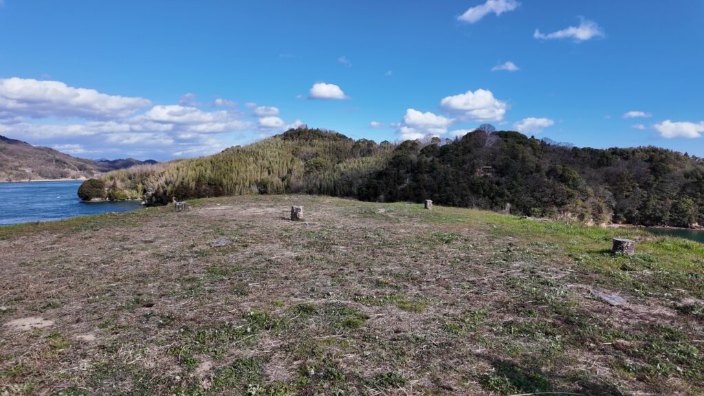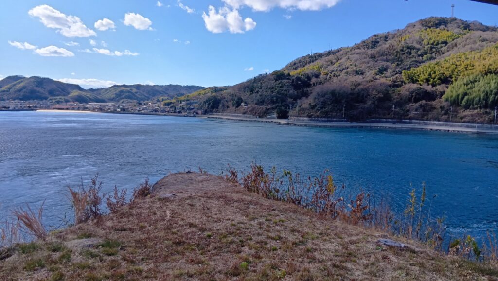 三の丸から見まわしてみると、対岸が伊予大島です。それから四阿の先には、目一つの鼻、という突端があって、鍛冶場だったという伝承があります。船だまりも見えます。