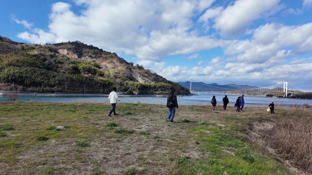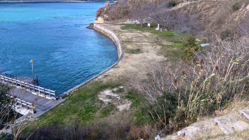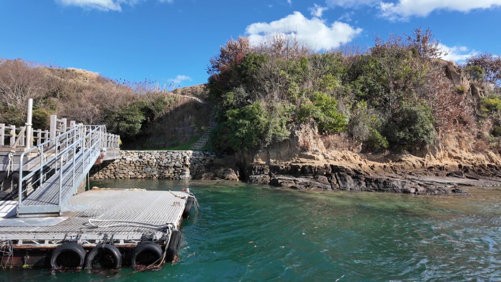 上陸した場所は、島で一番低い「南部平坦地」で、城があった時から埋め立てが進められていました。荷揚げや漁具の手入れなど、作業ヤードとして使われたと考えられます。