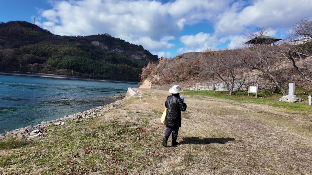 矢びつ出丸の周辺が、もっとも激しい潮流ポイントです。まるで、川の激流です。これが、堀と同じような役割で、お城を守っていたのでしょう。しかし、この船もこの中でよく留まっていられると思います。現代の村上海賊、といったところでしょうか。