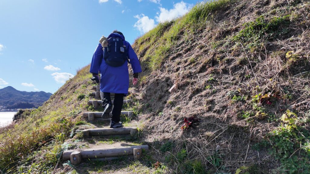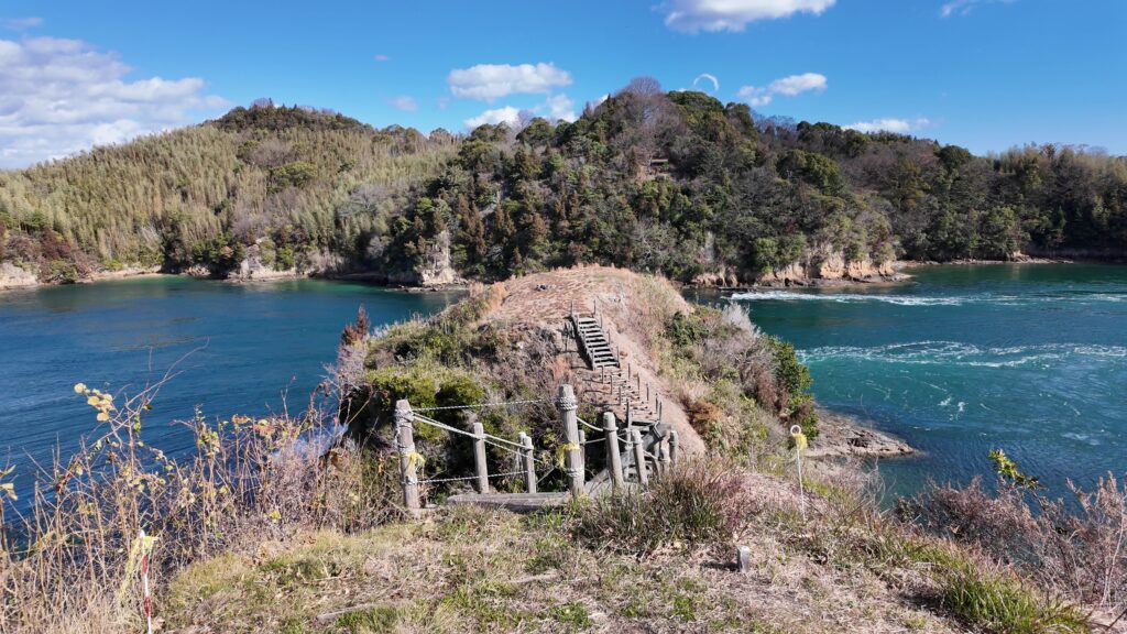 次はいよいよ本丸です。本丸への階段を登ります。本丸についてみると、鵜島の向こうの海峡(船折瀬戸)を行く船までよく見えます。