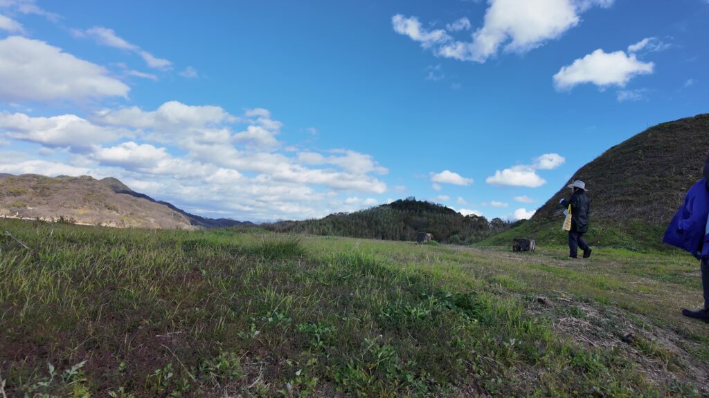 次は、二の丸です。一段高いところにあります。こちらも建物跡がたくさん発見されていて、やはり住居か倉に使われたのではないかとのことです。特に三の丸と接続するところで、高級な海外製陶磁器が見つかるそうです。お宝をしまう蔵だったのでしょうか。