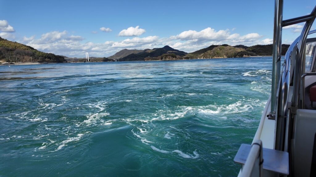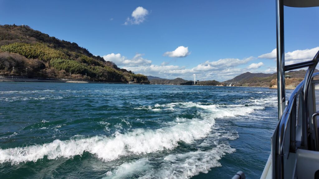 最後の潮流ポイントに向かいます。そこは、愛媛県有数の漁場なのだそうです。能島水軍レストランで出る魚もここでとれるのでしょうか。渦のような潮流が沸き上がる海面に、空の雲が映って、なんとも言えない絵柄です。そうこうするうちに、港に帰って来ました。