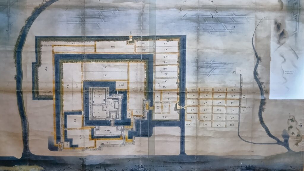 「正保今治城絵図(複製)」、城の右側が浅川、左側が蒼社川(今治城天守内にて展示)