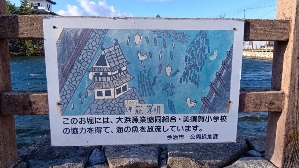 今治城に出ました。やはり、広い堀に城の姿が映えています。内堀には、魚も放流されているそうです。