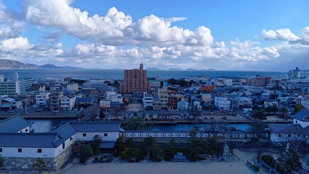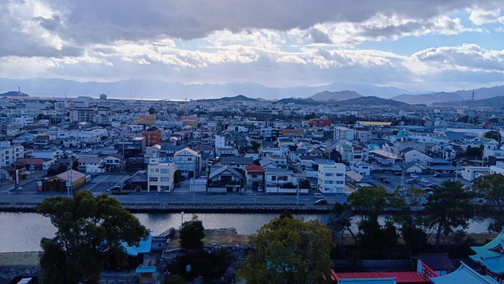 続けて南側です。四国の山々が見えます。高虎が当初拠点にしようとした国府山城は、真ん中辺りの小山のようです。
