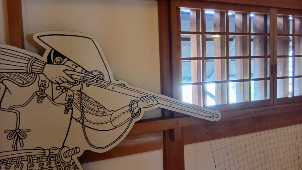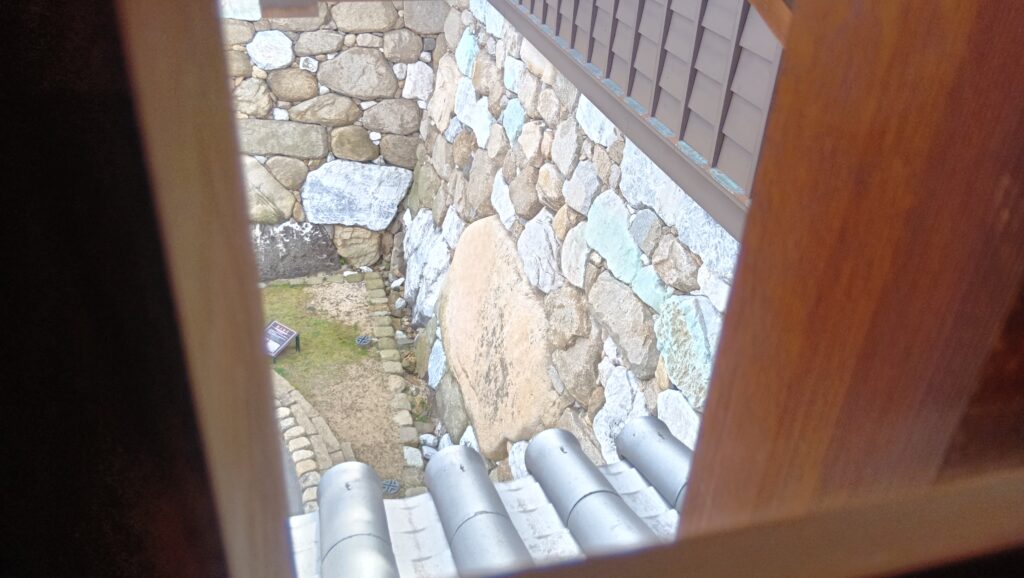 鉄御門の中では、兵士のフィギアによって防御方法の展示があります。石落としなどです。また、格子窓からは勘兵衛石が見えます。