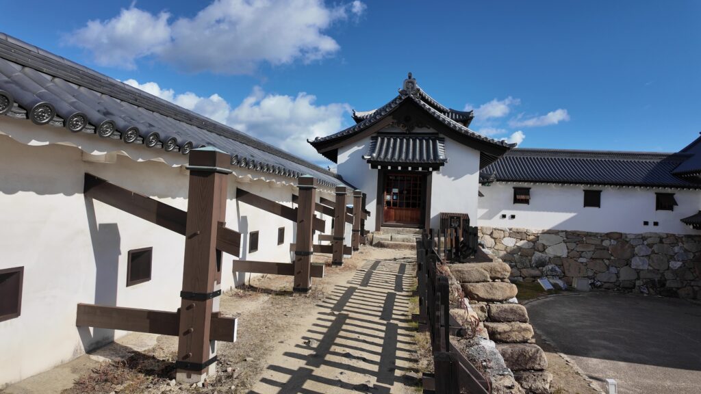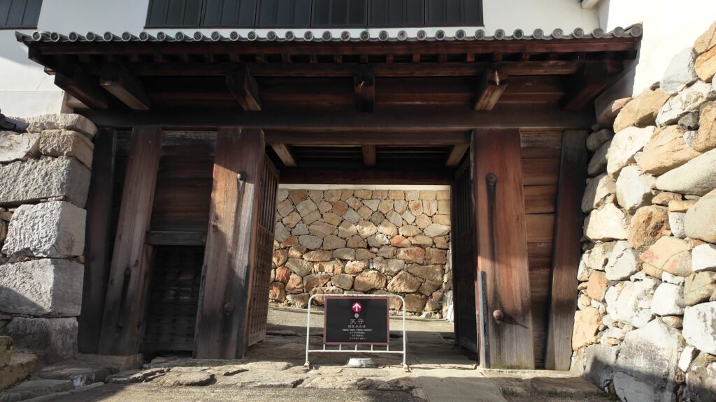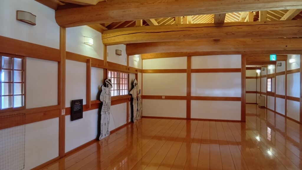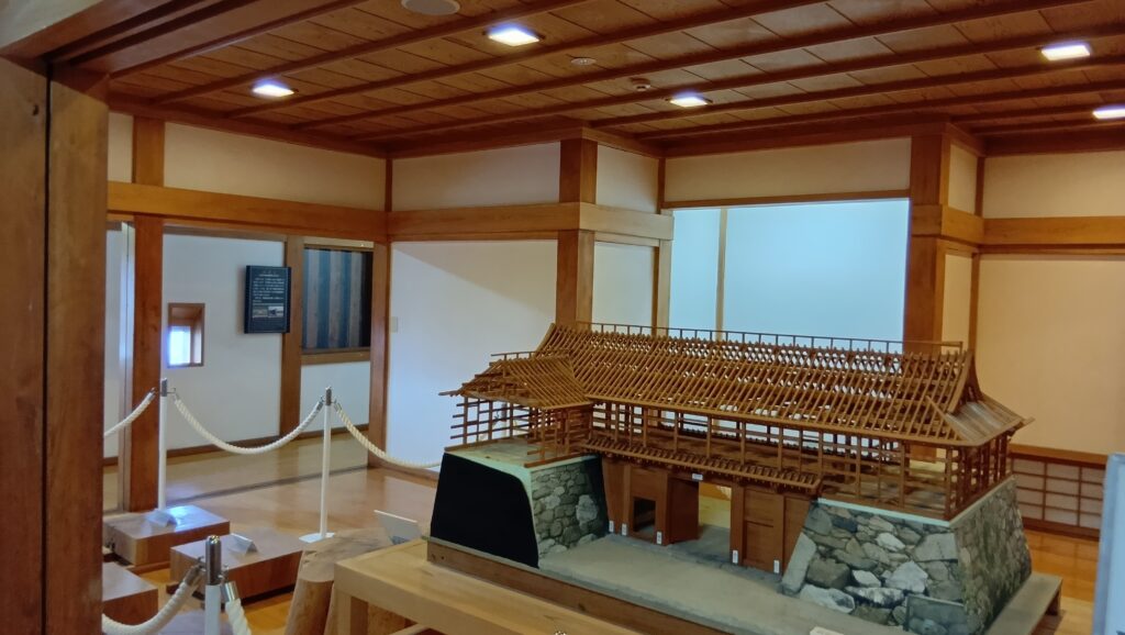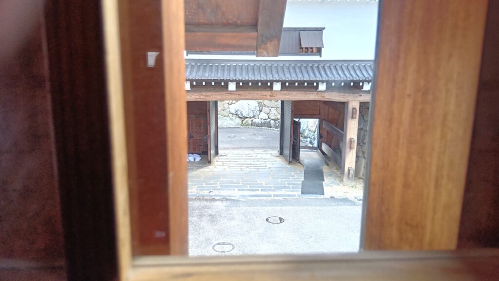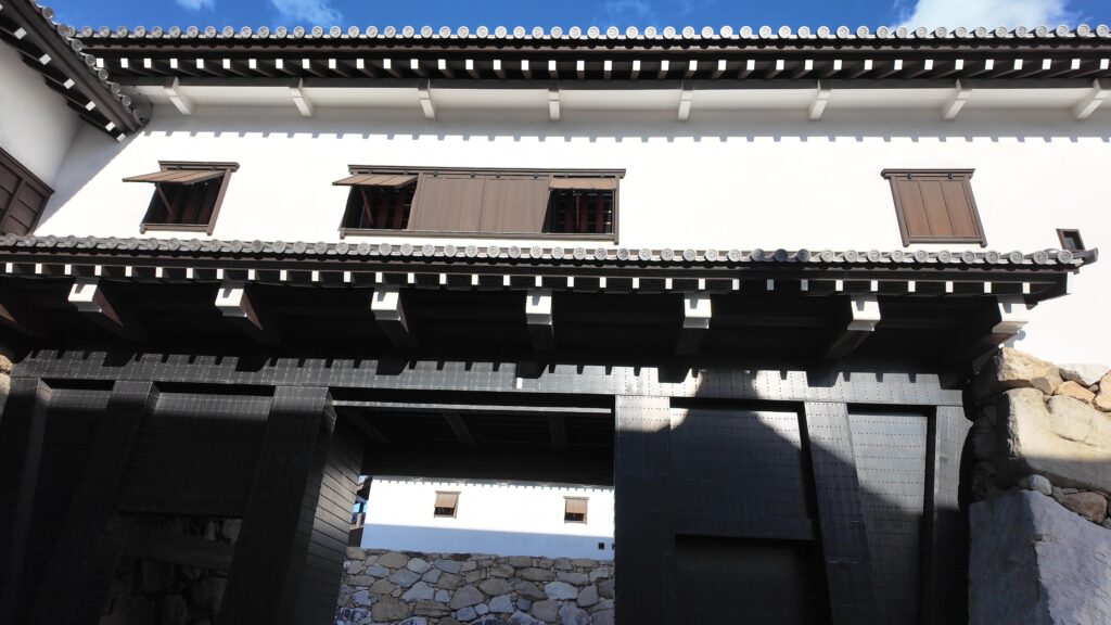 そして、最後に是非行っていただきたいのが、山里櫓から塀づたいに進んだ先の、鉄御門と武具櫓です。2つの建物は、再建時期や建て方は違うのですが、(武具櫓:1980年鉄筋コンクリート造外観復元、鉄門:2007年木造復元)中が多聞櫓でずっとつながっていて、高虎築城術でどうお城を守っていたか、わかりやすい展示になっているのです。