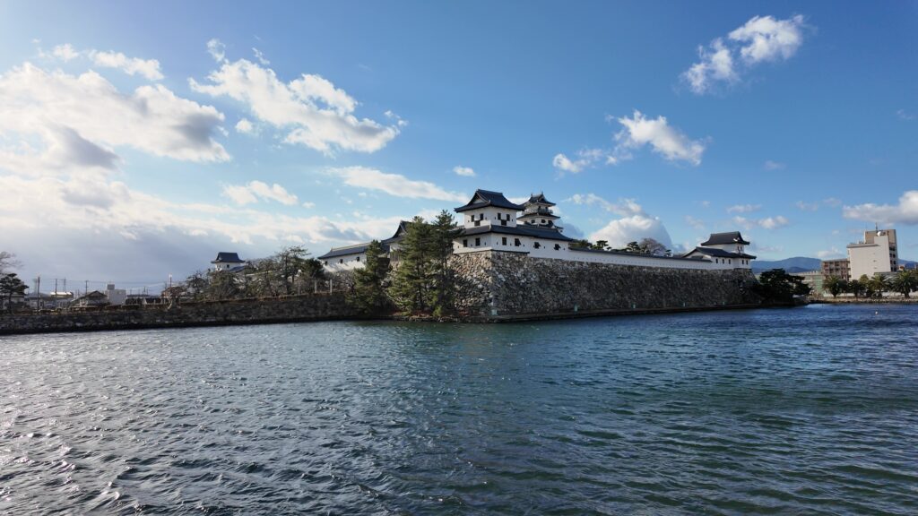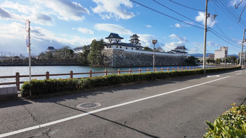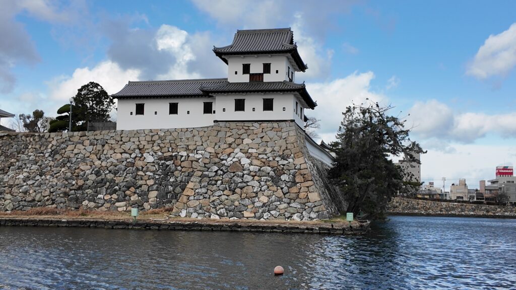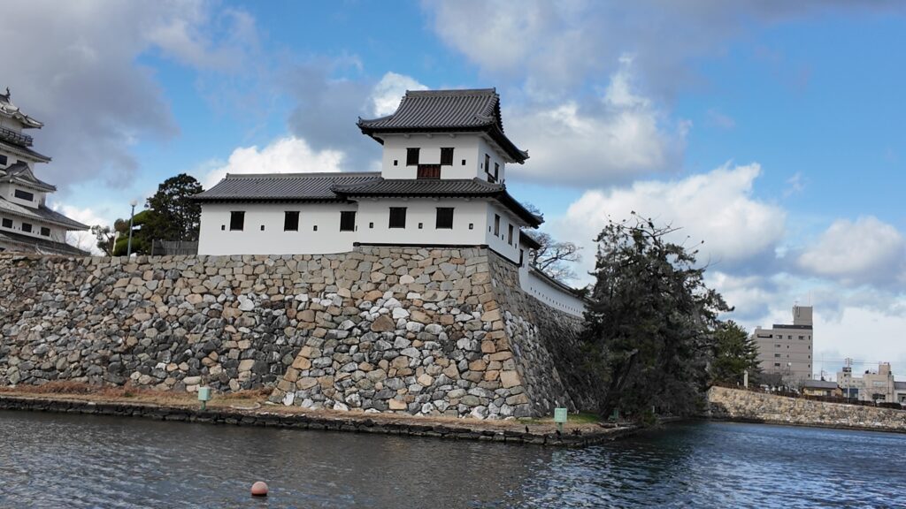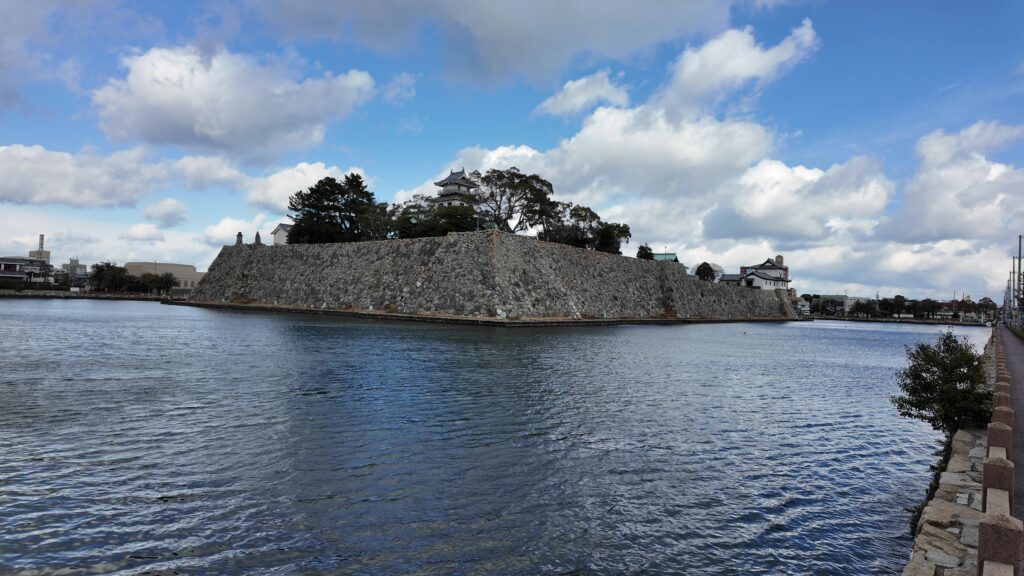 南の隅に来ました。櫓がなくても迫力があります。まるで堀に浮かぶ要塞のようです。遠巻きから石垣と犬走りも観察しましょう。