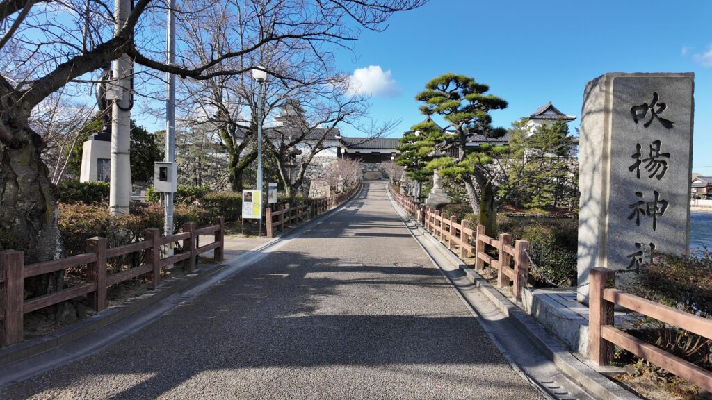 それを覚えておいて、天守に向かいましょう。すると、仕切りのような石垣が残っています。本丸の入口手前の石垣のようです。ということは、現代の天守への門は、本来は本丸の門だったのでしょう。門を入ると折れ曲がって、枡形風になっています。そして、本丸には現在は吹揚神社がありますが、かつては天守があったと考えられます。かつての姿をチェックできたので、現代の天守に入ります。