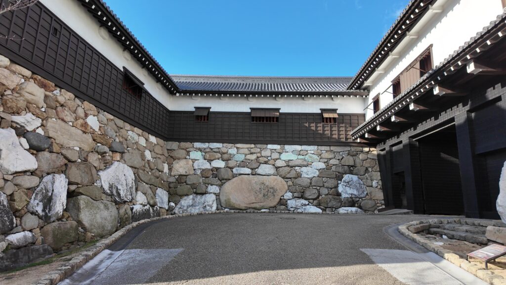 それでも、迫力は十分ですし、正面に巨石がはめこまれています。これは「勘兵衛石」といい、重さ約16トン、名称は築城の奉行を務めたと言われる渡辺勘兵衛にちなみます。こんなすごい枡形が、かつてはいくつもあったのでしょう。正面右側の鉄門(櫓門)から枡形を出ましょう。枡形を出ても、まだ別の櫓に囲まれています。こちらも復元された、武具櫓です。油断がなりません。中に入っていくと、天守が現れました。