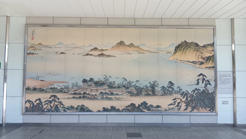 「絹本著色登覧画図(複製)」に描かれた三原城(三原駅壁面)