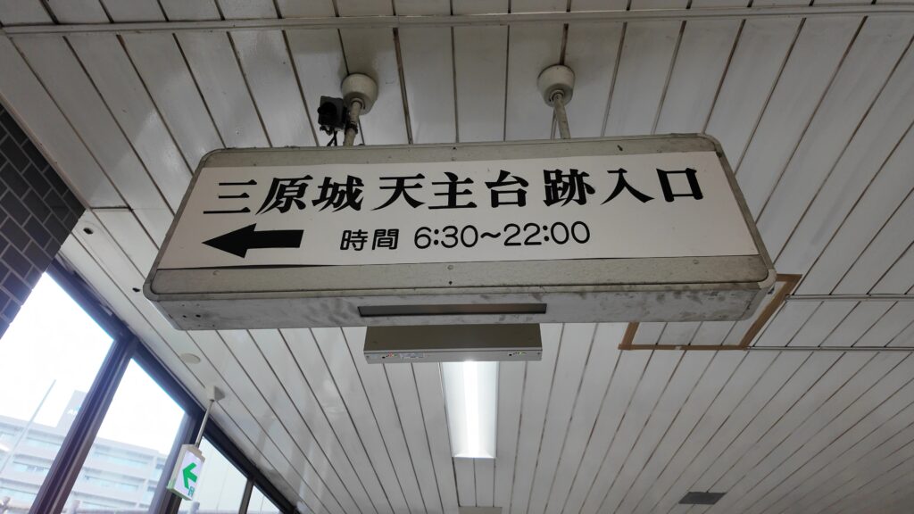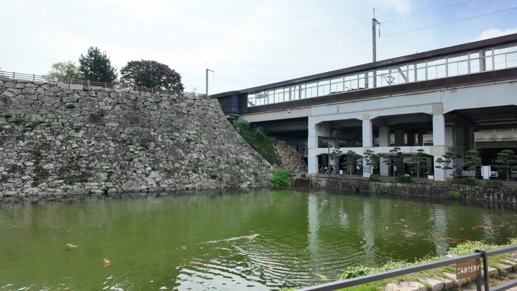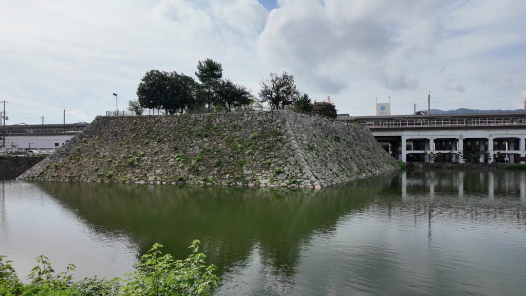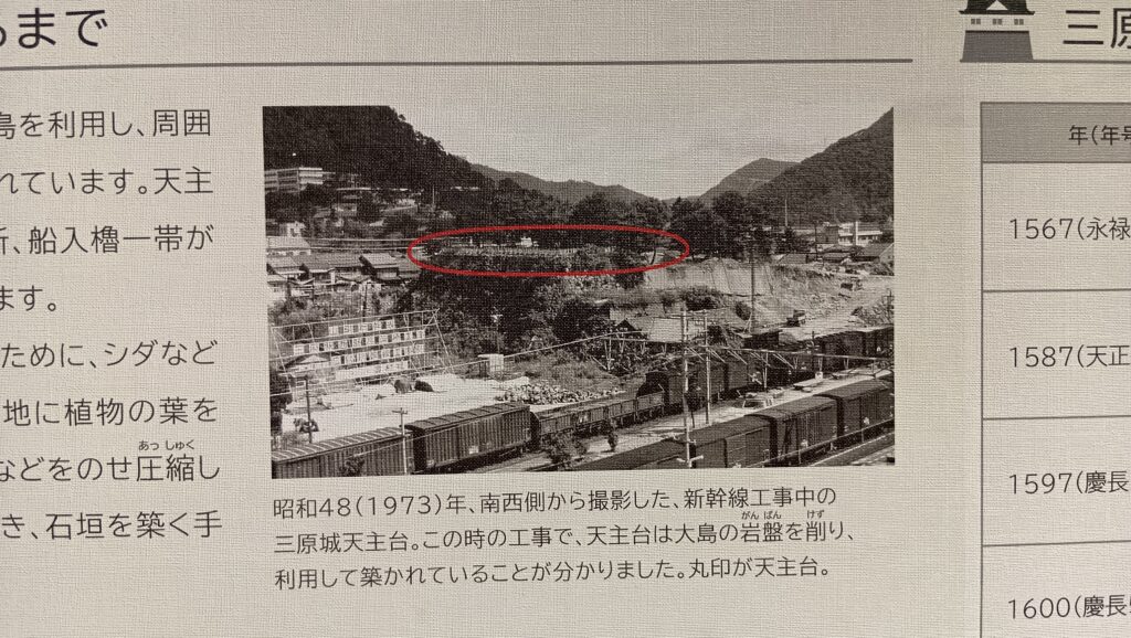 二度目の危機は、どの城もそうですが、明治維新の後でした。三原城のほとんどの建物や石垣は撤去され、堀も埋められました。本丸御殿は学校として使われましたが、移転時に取り壊されました。そして1894年(明治27年)、鉄道が本丸を貫いて通されます。天守台はかろうじて残りました。当時は近代化が優先された時代だったのでしょう。戦後になると山陽新幹線の駅も設置されたので、その高架が天守台に密着したような形になったのです。結果として、天守台は駅に直結した見学スポットになりました。
