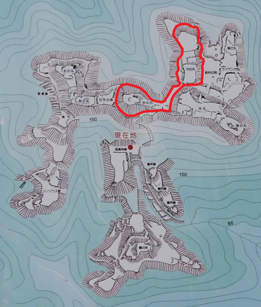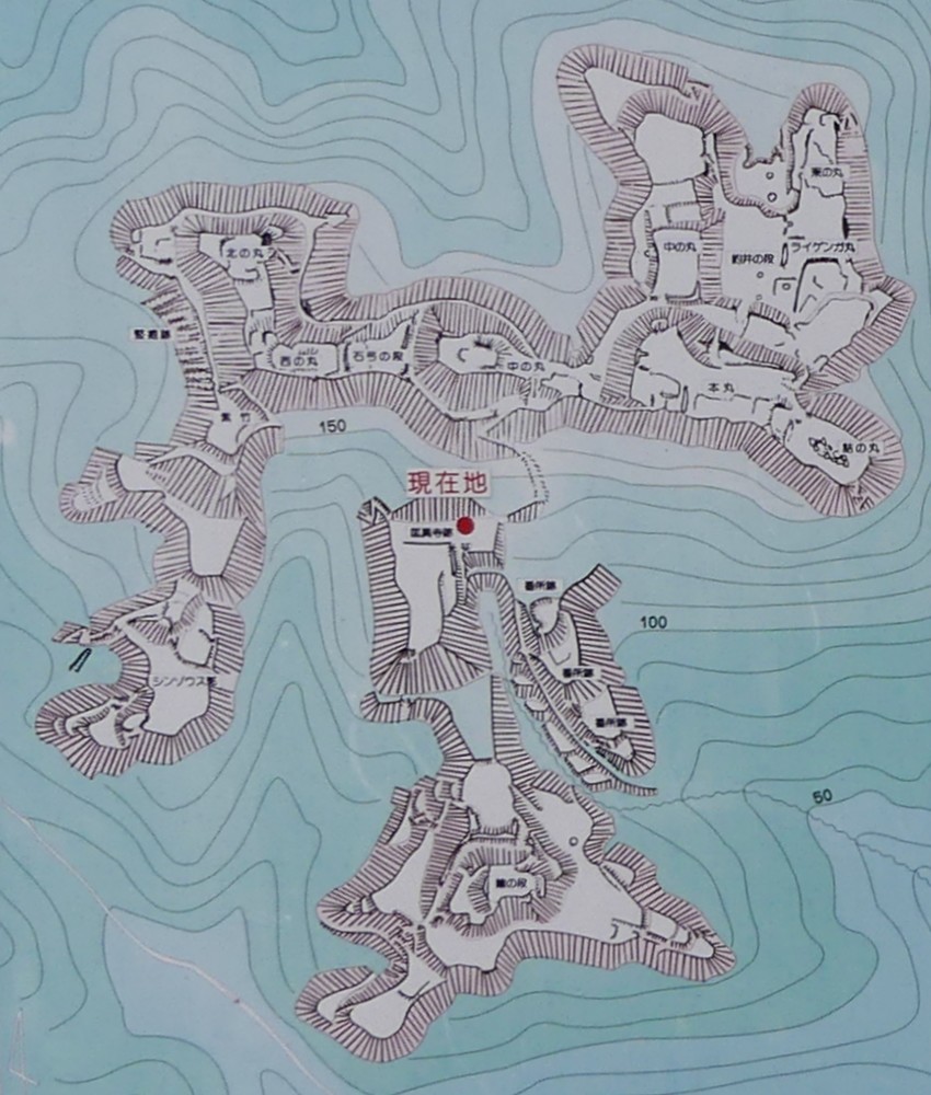 そして現在も残る天守台ですが、隆景時代に築かれ、正則時代に改修または拡張されています。その大きさは日本最大級で、江戸城天守台に匹敵します(一辺が4,50メートルくらいか)。完全に独立しているのではなく、本丸から土塁で一段高くなっています。元あった島のサイズからこうなったのかもしれません。ただし、天守が築かれることはなく、隅に3基の二重櫓が築かれ、多聞櫓によって連結されていました。