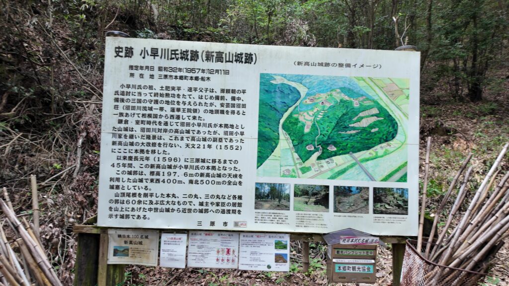 両小早川氏の当主となった隆景は、沼田小早川氏の本拠・高山城に入りますが(1551年、天文20年)、翌年には新しい本拠・新高山城を築城します。実は、この2つの城は沼田川を挟んだ、2つの山の上にそれぞれあるのです。なぜわざわざ、すぐ近くの似たような場所に新たに本城を築いたのでしょうか。一つには、それぞれの山の別名にヒントがあります。高山城の方は「雌高山(めすたかやま、他には妻高山など)」、新高山城の方は「雄高山(おすたかやま)」とも呼ばれていて、その印象からもわかる通り、新高山城の方が急峻な地形で、岩山の上に築かれ、防御力が高かったからと思われます。次に、当時は海が沼田川まで入り込んでいて、新高山城の辺りが船着場として丁度よかったとも考えられます。また、新当主として人心を一新し、家臣団を再編成するよい機会にもなったでしょう。