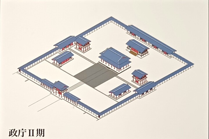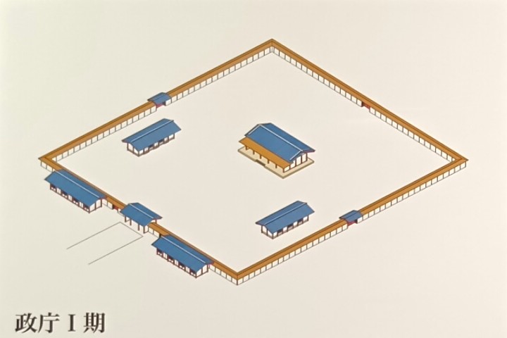 多賀城は、当初から国府と鎮守府を兼ねた拠点だったと考えられ、その後8〜11世紀の約300年間にわたって機能しました。その歴史は、大まかに4つの時代に区分できますが、中心にあった政庁の姿から追っていきたいと思います。第1期は、724年に大野東人によって創建されたときの姿です。奈良に都が遷された(710年)後のことです。正殿を中心に、主要建物は瓦葺きでしたが、柱は掘立式でした。大野東人は、陸奥按察使兼鎮守将軍に任命され、733年にできた出羽国・秋田城支援のために出撃し、連絡路を開きました。