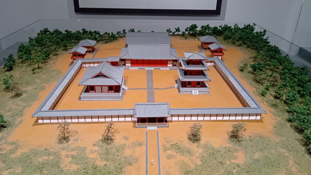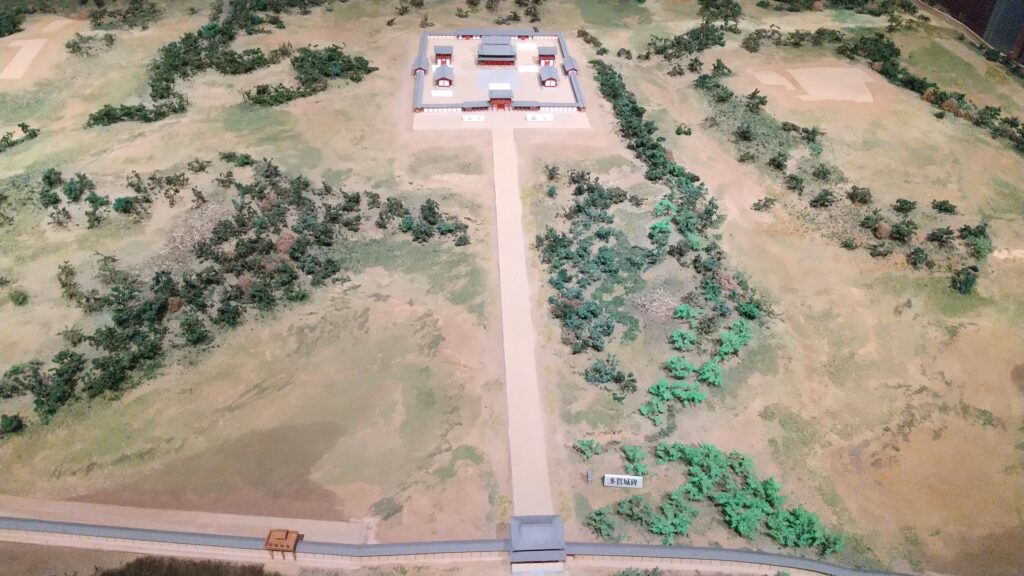 多賀城の建設は、8世紀前半に起きた蝦夷の反乱をきっかけに、陸奥国を再編する過程(岩城・岩背国の分離と再統合)で行われたと考えられます。724年(神亀元年)に按察使・大野東人(おおの の あずまひと)が築城したとされています。位置は、仙台平野と大崎平野の中間にある丘陵地帯が選ばれました。河川による交通の便も考慮されたようです。多賀城は、3つの領域から構成されていました。中心が政庁域で、約100m四方の築地によって区切られていました。その周りが実務を行う役所が立ち並ぶ曹司(そうじ)地域で、こちらも築地や塀で囲まれていました。その外側が国府域で、住居や工房などの都市空間が成立していました。名称は当初は「多賀柵(続日本紀)」でしたが、途中から「多賀城」に改名されています。「柵」も「城」とも同じ「き」と読めるので、字を変えただけかもしれませんが、機能の違いによって区別されていた可能性もあります。