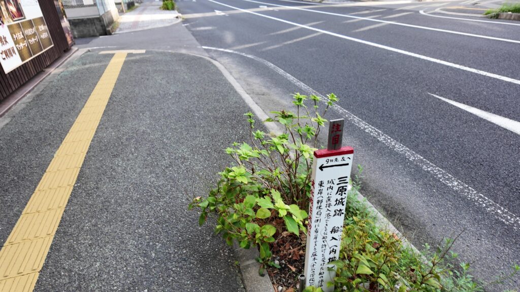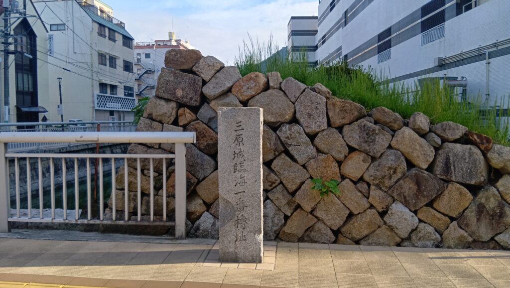 お堀を追って行きましょう。堀が切れた角のところに、石碑があります。「三原城 臨海一番櫓跡」とあります。ネーミングのおかげで、ここが曲輪の端で、この先が海だったことがわかります。ということは、ここを曲がった通りは、海に面した曲輪のラインなのです。この歩いている道の右側がみんな海でした。そして、左側には、二番櫓、三番櫓が続いていました。このまま行くと、別の隅っこに着きます。そこが、次のご案内場所です。石垣が見えてきました。