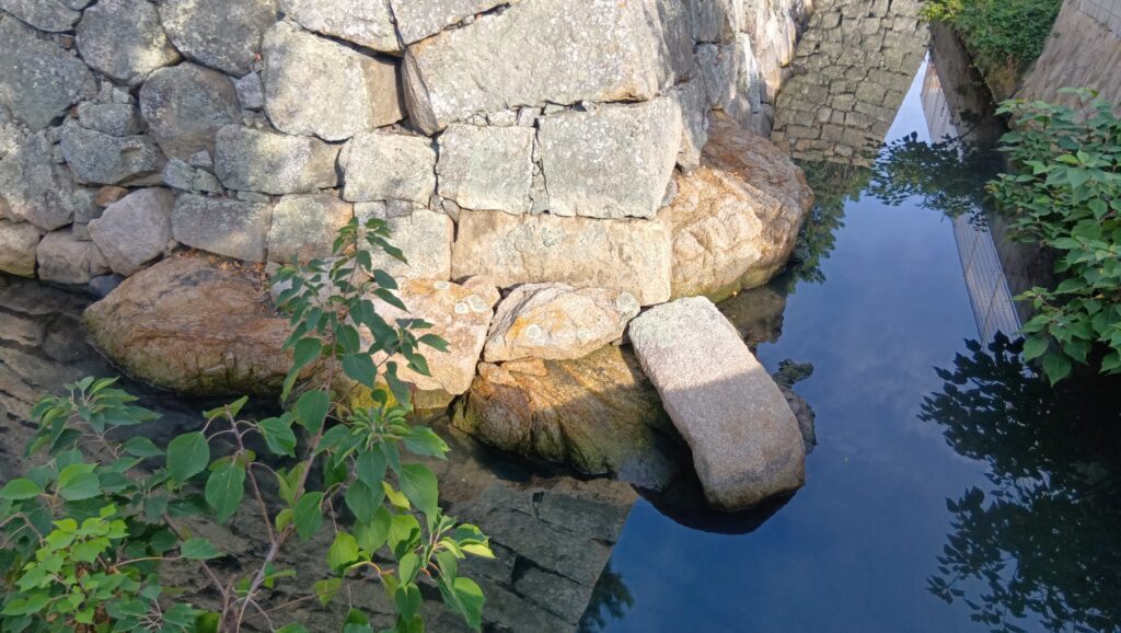 そして、なによりも面白いところが、曲輪の南東の隅に当たる場所にあります。石垣の石ではなさそうな岩があります。これは、元からあった岩礁なのです。ここは元あった島の一つ(小島)で、残っているこの岩礁がその証拠なのです。その周りも少しお堀として残しています。