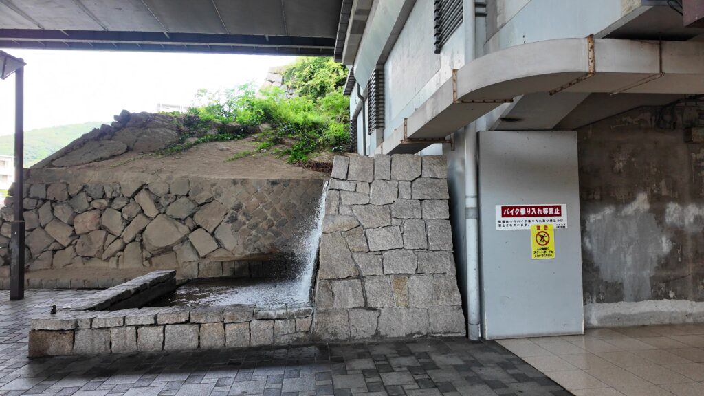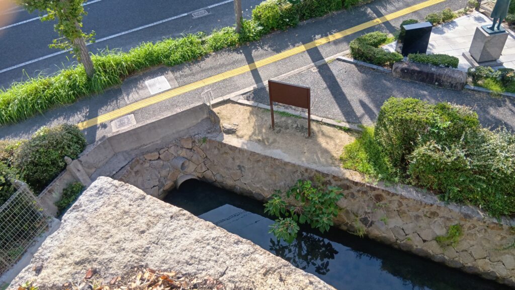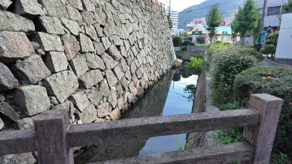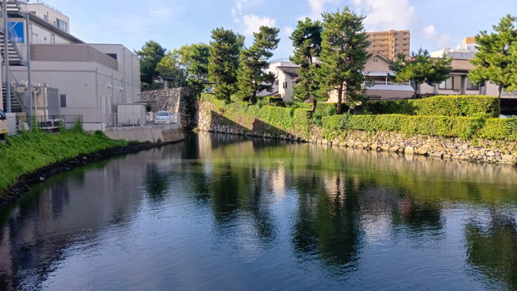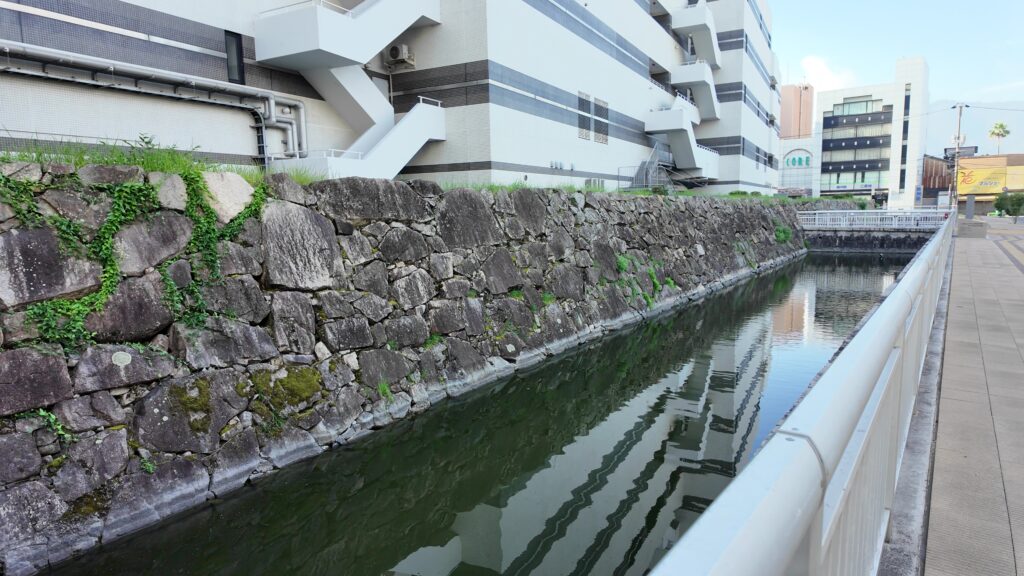 駅前広場から通りを渡って、右側にある通りが、大体そのラインに沿っています。ということはこの通りはお堀だったのです。と思っていたら、堀が残っています。実際は、通りを含めてもっと幅が広かったのでしょう。お堀沿いには石垣も残っています。