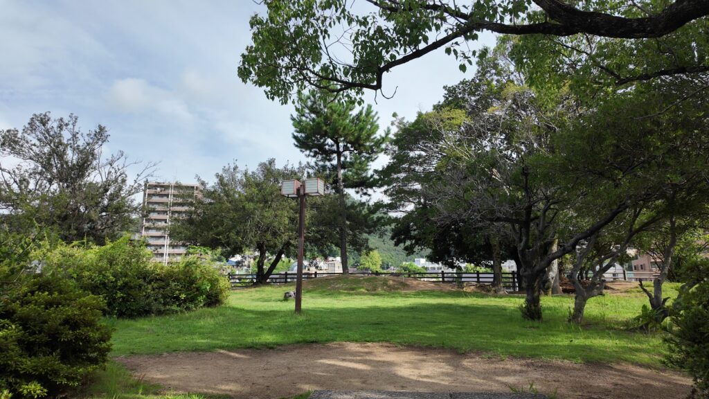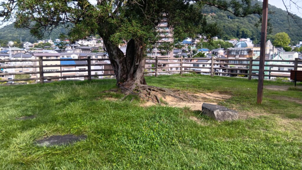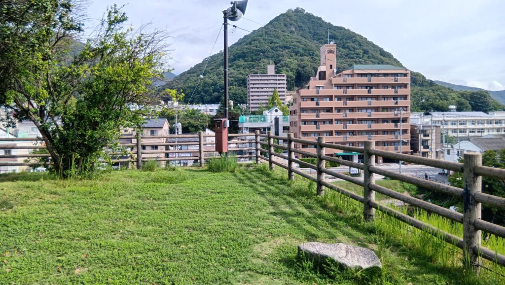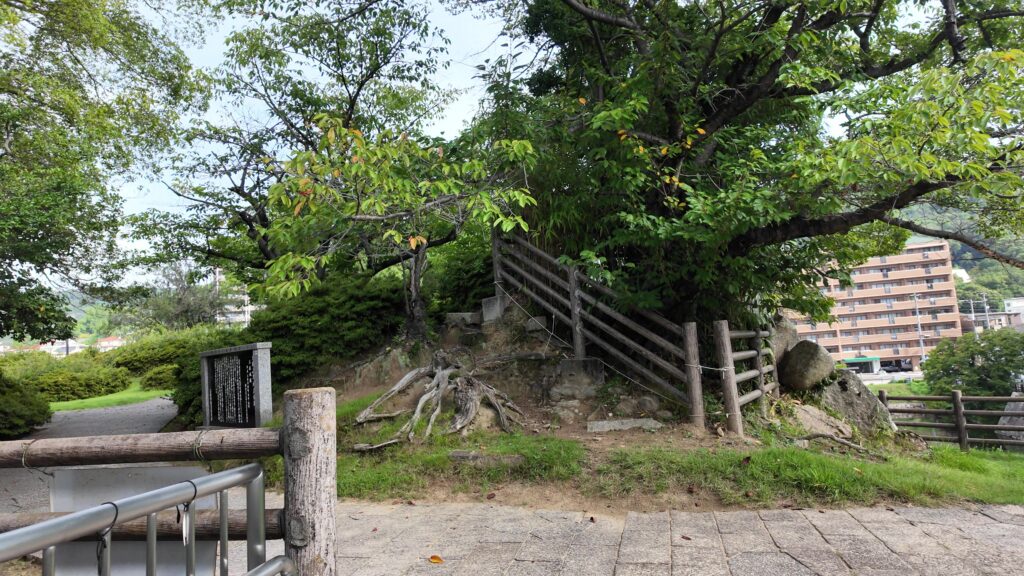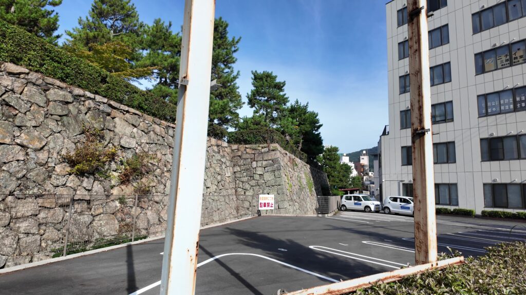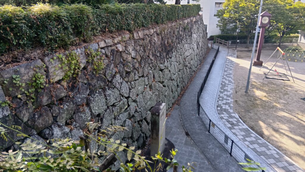 周りを歩いてみましょう。天主台というより、曲輪という感じもします。実際に隅には櫓が3基ありました。駅に一番近いところに一基、そこから離れていって、北西隅のところに一基、元々城があった桜山を見ながら、進んだ先の北東隅にも一基あったのです。
