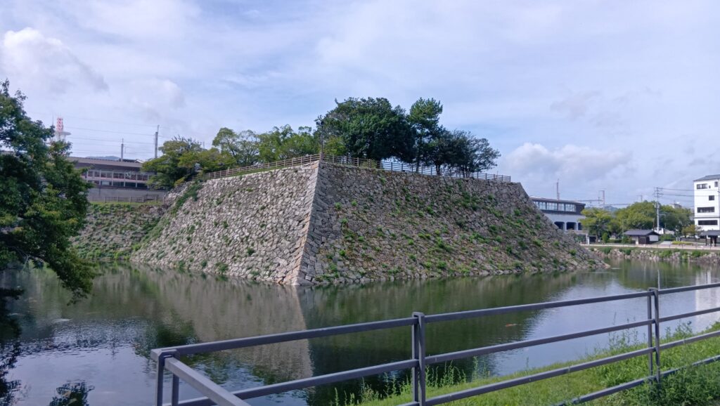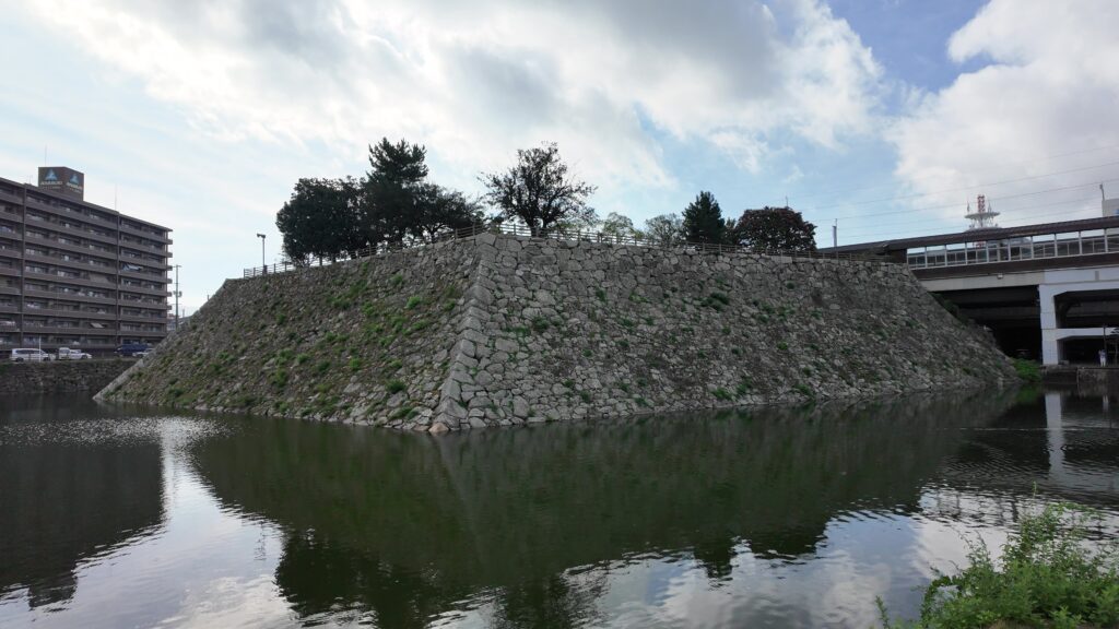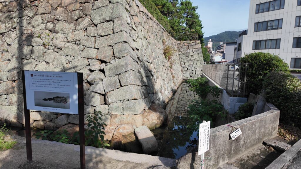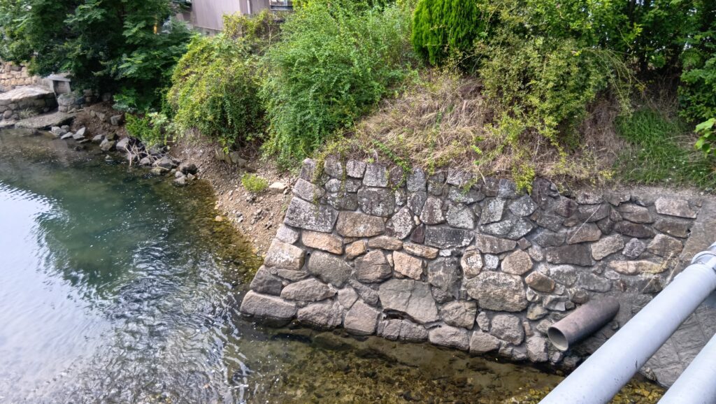 他の見どころも少しご紹介します。まず「水刎(みずはね)」です。昔の絵図で見ると、堀と一緒に外側の川(和久原川)が曲げられているところで、水の流れを緩やかにするために築かれた石垣です。