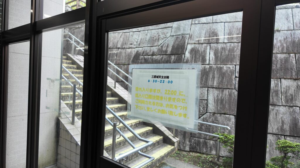 ここが入口のドアです。ドアを開け閉めして階段をまた上がります。天主台上に到着です。ゴツゴツした感じがして、ここも島だったという雰囲気があります。実際、新幹線の工事のときに、島を削って造成したことがわかったそうです。