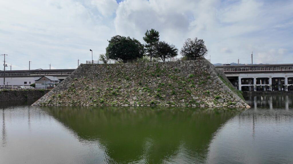 後半は、天主台を中心にご案内します。また駅前に戻っています。ここが本丸だったので、スタート地点にはちょうどいいです。今度は駅の反対側にいきます。また石垣が見えます。駅をくぐっている間にあるのが本丸の石垣で、出たところに現れるのが、小早川隆景が築いた天主台です。この隅の石垣の積み方がなんともかっこいいです。