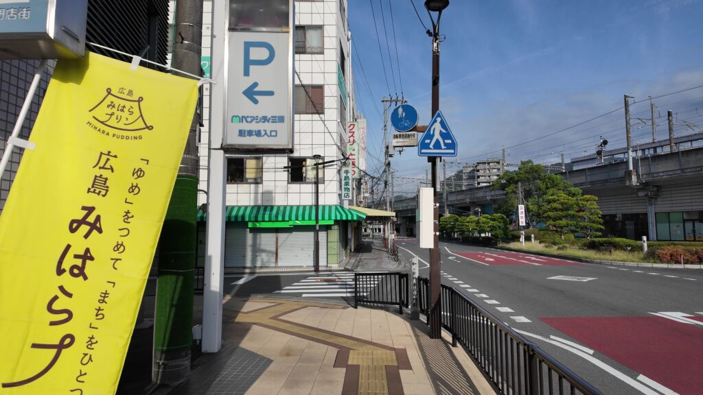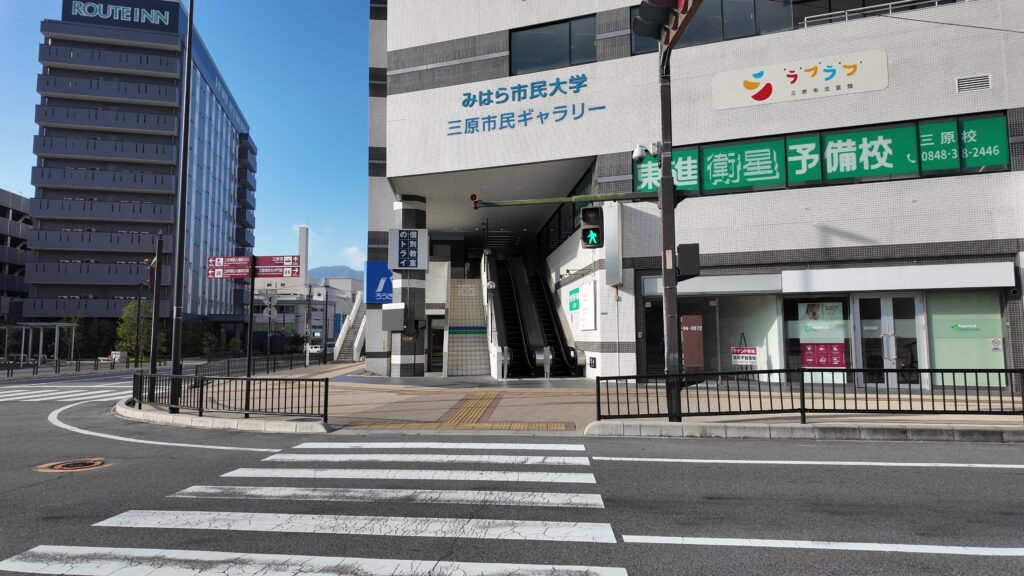 前回の新高山城跡見学に引き続いて、三原駅に着いたところです。駅には、三原城の素晴らしい絵が飾られていて、気分が盛り上がります。すぐ近くには三原観光協会があって、情報収集もできます。