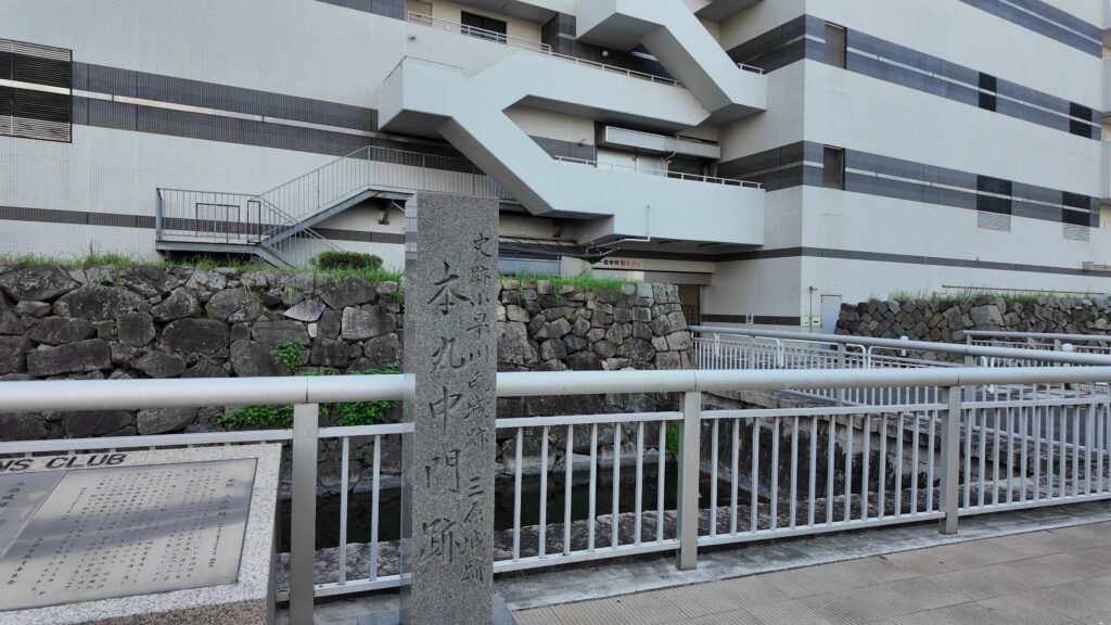 説明パネルがあって、本丸中門跡ということです(「二の丸中門」ではないかという意見もあるようですが)。ここは、西側に張り出した二の丸の一部から渡れるようになっていたのです。限られた出入口の一つでした。今も施設の出入口として使われているところがいいです。