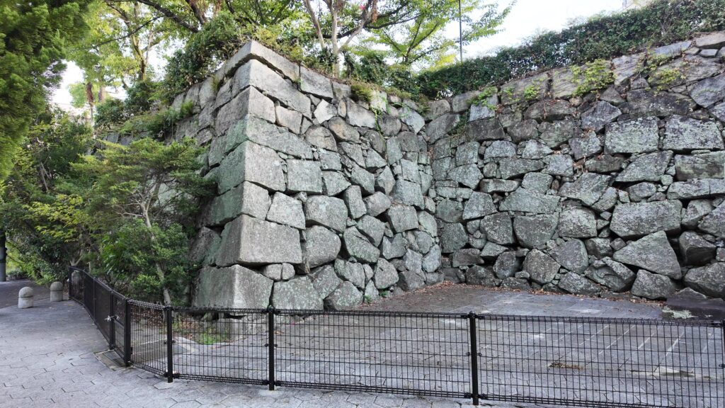 城町(しろまち)公園のところに、船入櫓跡の石垣が残っているのです。こちら方が先にできたのですが、街中に突然現れる感じがします。石垣自体は、福島時代以降に築かれたとされています。石垣のラインが折れ曲がっていいますが、ここは船入なので、敵船がきたときに、いろんな方向から反撃できるようにしたのです(横矢)。