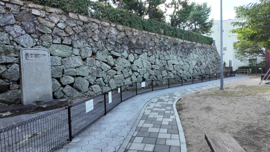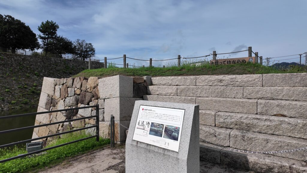 北側正面から見た天主台です。駅と一体化している姿も、定番になってきたように思います。その近くに、一部復元された後藤門石垣というのがあります。城の南側が海だったので、北側に西国街道が通り、その途中に後藤門があったのです。