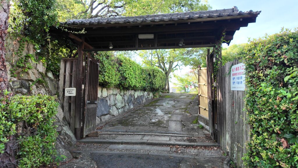 また船入が見えてきて、この辺からまた曲輪のラインに沿っています。登って行く感じが、島っぽくていいです。門がお出迎えで、入ってみると、垣根に囲まれた何気ない空間です。