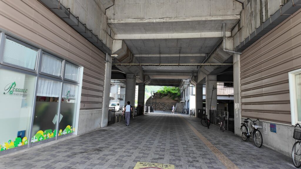 そのラインの先は船入櫓跡になっていて、石垣の上も公園になっています。そこにも行ってみましょう。今いるところは行き止まりになっているので、少し戻る必要があります。一旦三原駅の方に向かいます。案内があるので、斜めの道に入っていきましょう。