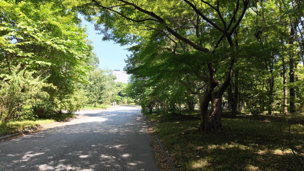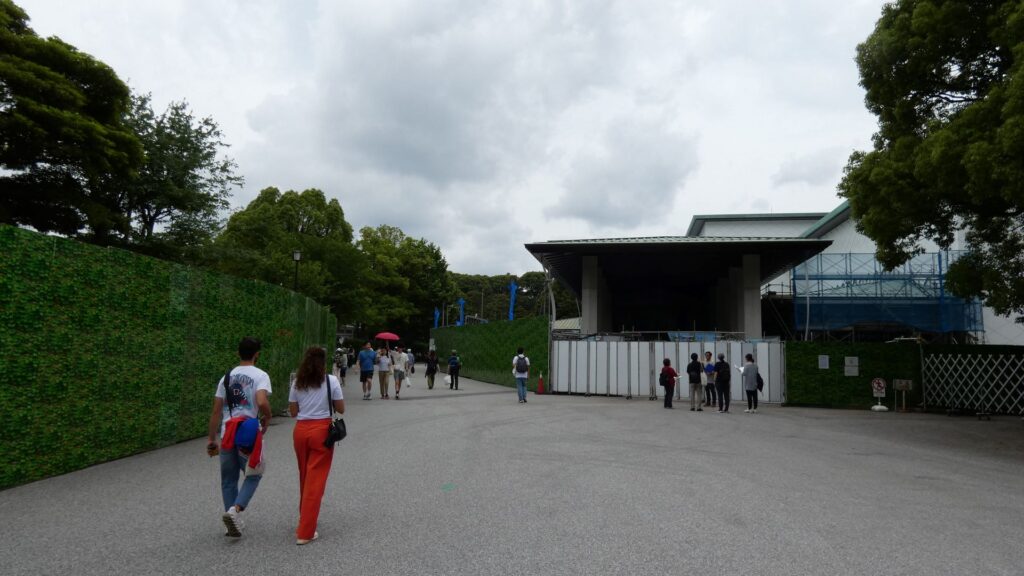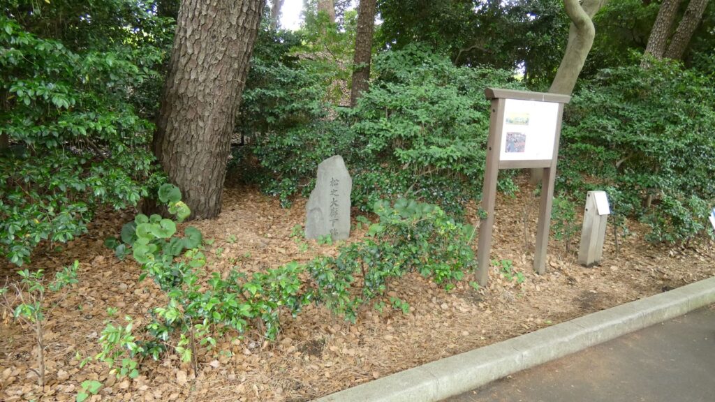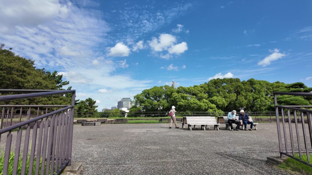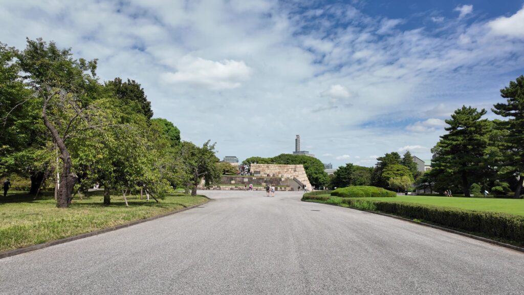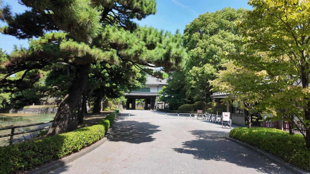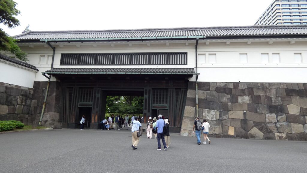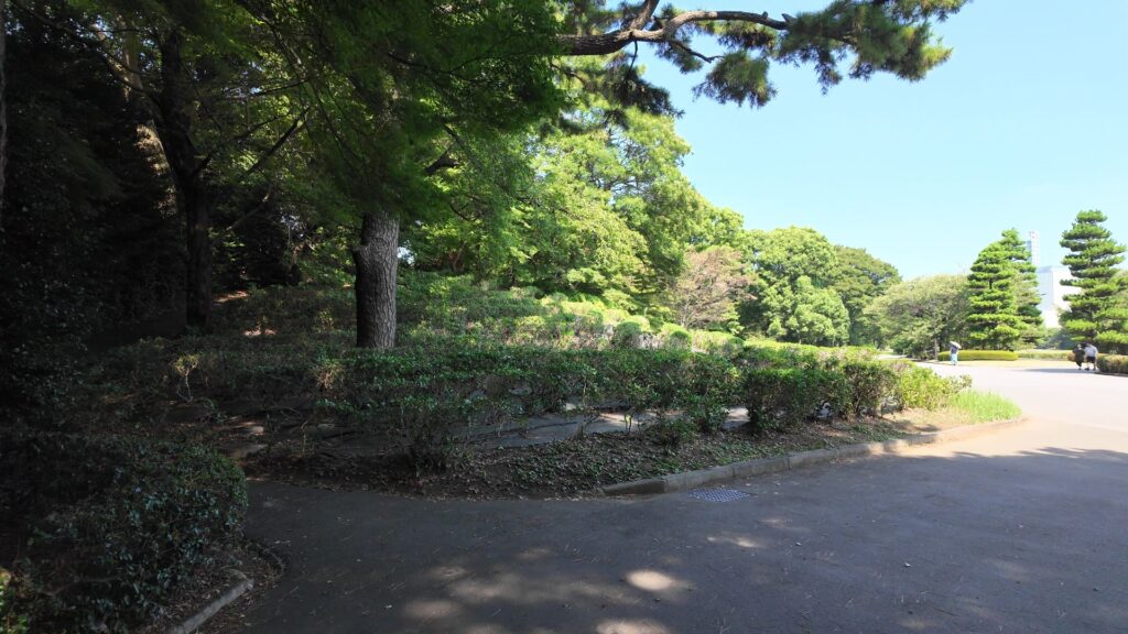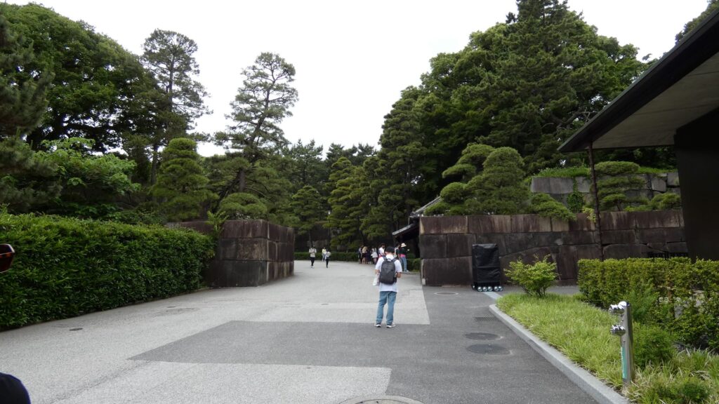 門の内側が本丸御殿の跡なのですが、今は広場になっています。想像力が必要な場面です。思うに、広場に出たところは、「虎の間」あたりだったのではないでしょうか。大名が将軍に謁見するのを待っていた部屋です。それなので、左の方に行けば、大広間があったところだと思うのです。