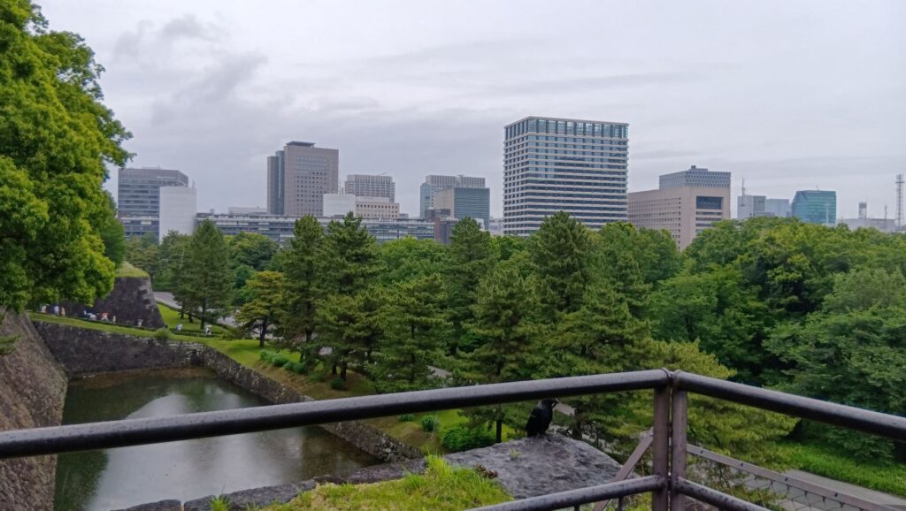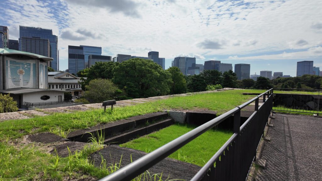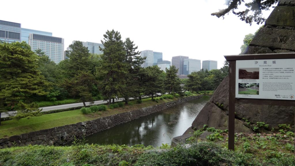 かつては海が見えたという「汐見坂」の下にきました。今はどんな景色なのか登ってみましょう。坂の右と左の石垣ってだいぶ違います。右の石垣は先ほど見た石垣です。左側の白鳥濠にある石垣は、家康時代に築かれ、技法も粗い加工の石を使った打ち込みハギなのですが、関東大震災のときも大丈夫だったそうです。古い石垣だから、弱いということではないようです。坂の上あたりまで来ました。やっぱりビルの景色です。でも、名前を残してもらえば、昔はこうだったとわかります。