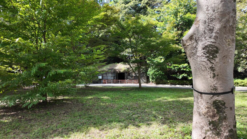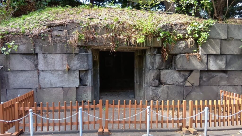 富士見多聞まで戻って、先に進みます。天守台に行く前に、もう一つ現存アイテムをご紹介します。「石室」です。御金蔵だったという説もありますが、非常時に大奥の調度品を避難させる場所だったようです。つまり大奥が近くにあったということです。石室から少し離れた辺りに、将軍が大奥に渡った御鈴廊下がありました。