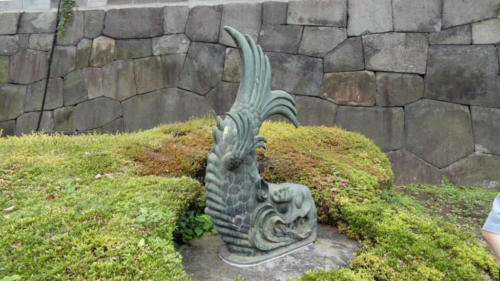 開門しましたので、行きましょう。手荷物検査が終わってから、中に入ります。現在ある建物部分は、空襲で焼けた後に復元されたものだそうです。今でも立派な門と枡形で、さすが、城の正門です。枡形内にはオリジナルの鯱があります。石製の雁木や銃眼も残っています。門を防衛する仕組みです。櫓門をくぐって、三の丸に進みましょう。